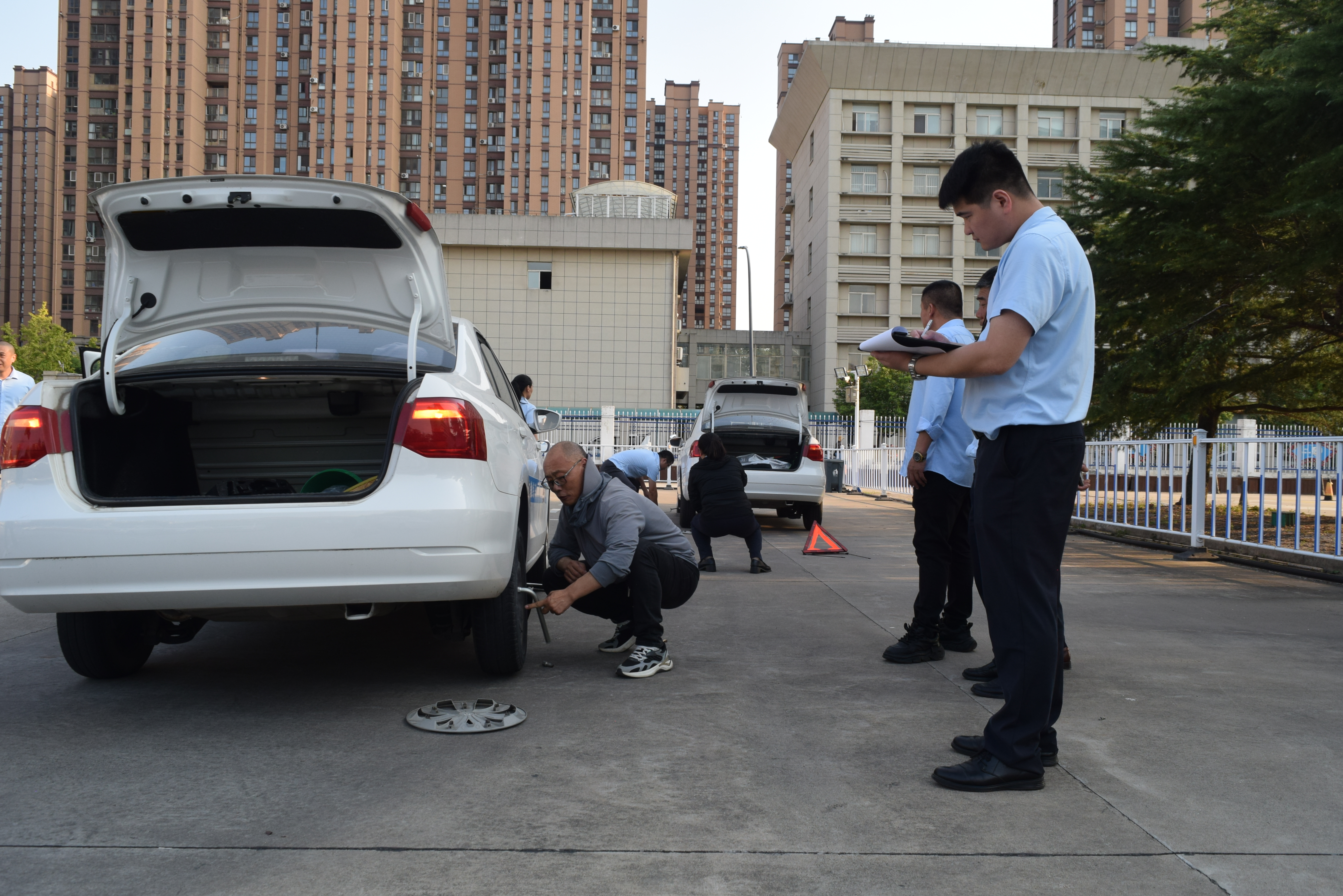比賽中,選手們熟練地取出千斤頂、套筒等車輛輪胎拆裝工具進(jìn)行輪胎更換作業(yè),拉起手剎、打開危險報警閃光燈、擺放三角警示牌、卸裝輪胎等一系列操作一氣呵成。比賽現(xiàn)場看似平靜,但其實大家都在暗暗較勁兒,氣氛異常激烈。經(jīng)過兩個小時緊張又激烈的角逐,最終3名教練員脫穎而出,取得了前三名的好成績。