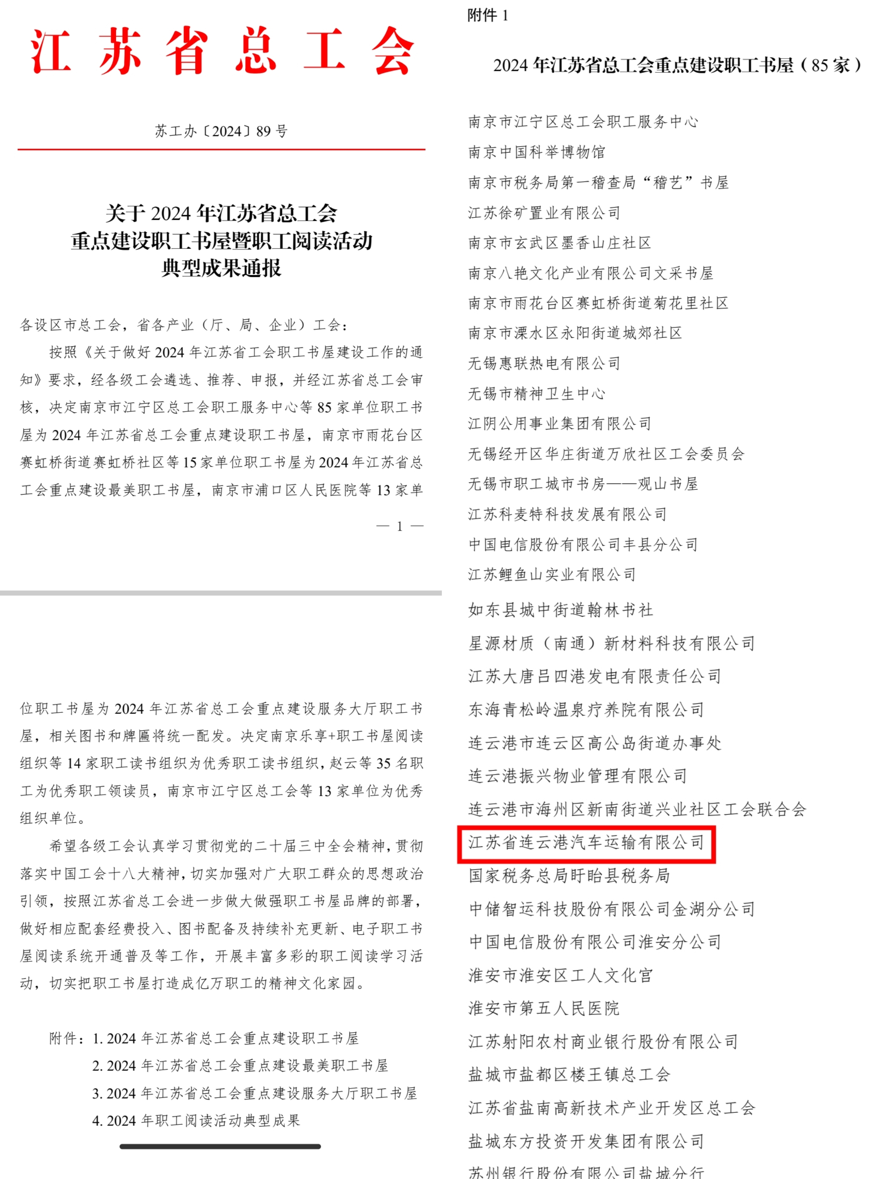 近日,從江蘇省總工會傳來喜訊,連云港汽車運輸有限公司職工書屋榮獲2024年度江蘇省總工會重點建設職工書屋的稱號。