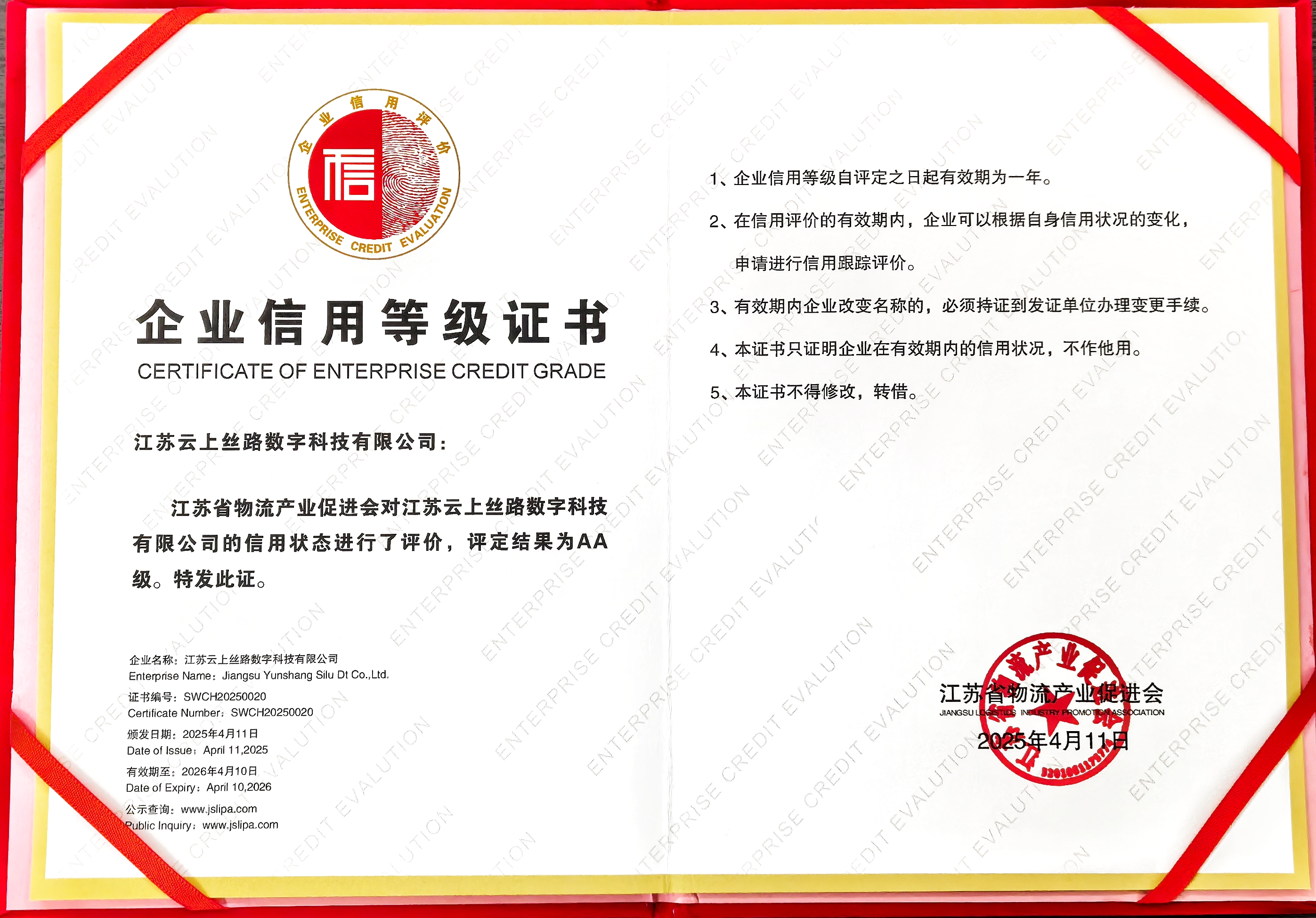 信用筑基,打造智慧物流標桿。企業(yè)信用評級是衡量物流企業(yè)綜合實力的重要指標,涉及企業(yè)管理、服務質量、社會責任、履約能力等多個維度。信用是企業(yè)的生命線。云上絲路公司自2023年8月成立以來,始終將誠信經(jīng)營視為企業(yè)發(fā)展的基石。從供應鏈管理到客戶服務,從技術創(chuàng)新到社會責任,云上絲路始終以高標準、嚴要求踐行誠信理念,贏得了客戶、合作伙伴及行業(yè)的廣泛贊譽。云上絲路將以更高標準構建透明、可信的智慧物流生態(tài),助力行業(yè)高質量發(fā)展。