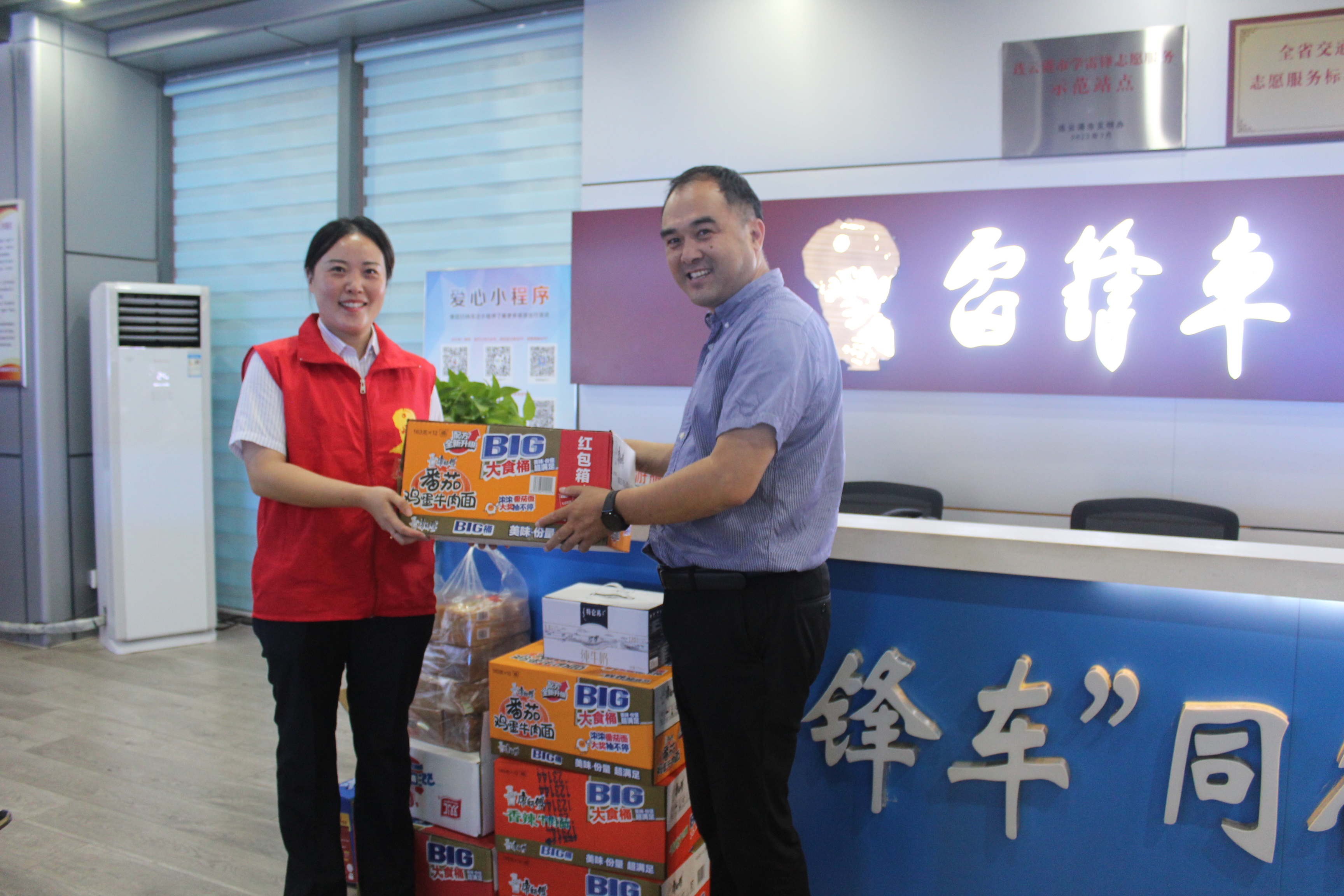 9月28日,在連云港市高鐵站“雷鋒車”驛站前,一抹抹“志愿紅”隨處可見,她們?yōu)榧磳⒌絹淼募偃湛土鞲叻遄龊昧藴?zhǔn)備。汽車公司工會為堅守在“雷鋒車”驛站的“雷鋒車”手們送上面包、牛奶等慰問品,為他們送去節(jié)日慰問與祝福。為應(yīng)對客流高峰,中秋國慶假期“雷鋒車”手志愿者們要連續(xù)奮戰(zhàn)在高鐵站,開展旅客幫扶、交通指引、免費接駁等工作。汽車公司副總經(jīng)理、工會主席張春軍表示:在連云港市“雙節(jié)”出行客流高峰,“雷鋒車”手們堅守崗位,無私奉獻(xiàn),不折不扣地落實公司的決策與部署,以群眾所需為己任,溫暖旅客回家路,展現(xiàn)了新時代“雷鋒車”手的風(fēng)采。