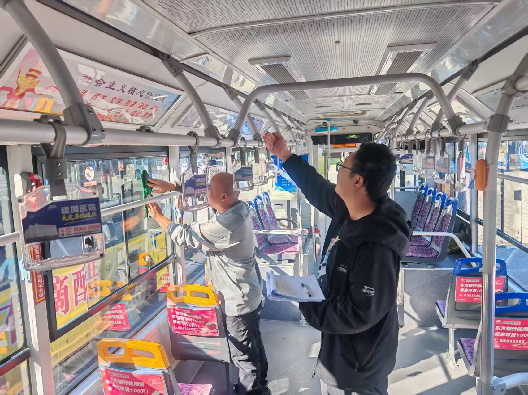 本次檢查堅持“全面覆蓋、不留死角”的原則,重點核查車容車貌、車身及車窗清潔度,以及車廂內(nèi)座椅、扶手、地板等關(guān)鍵部位的衛(wèi)生狀況。檢查組還關(guān)注垃圾桶清理情況、通風設(shè)施暢通性、車內(nèi)標識完好度,以及扶手、投幣機等高頻接觸區(qū)域的清潔消毒是否達標。