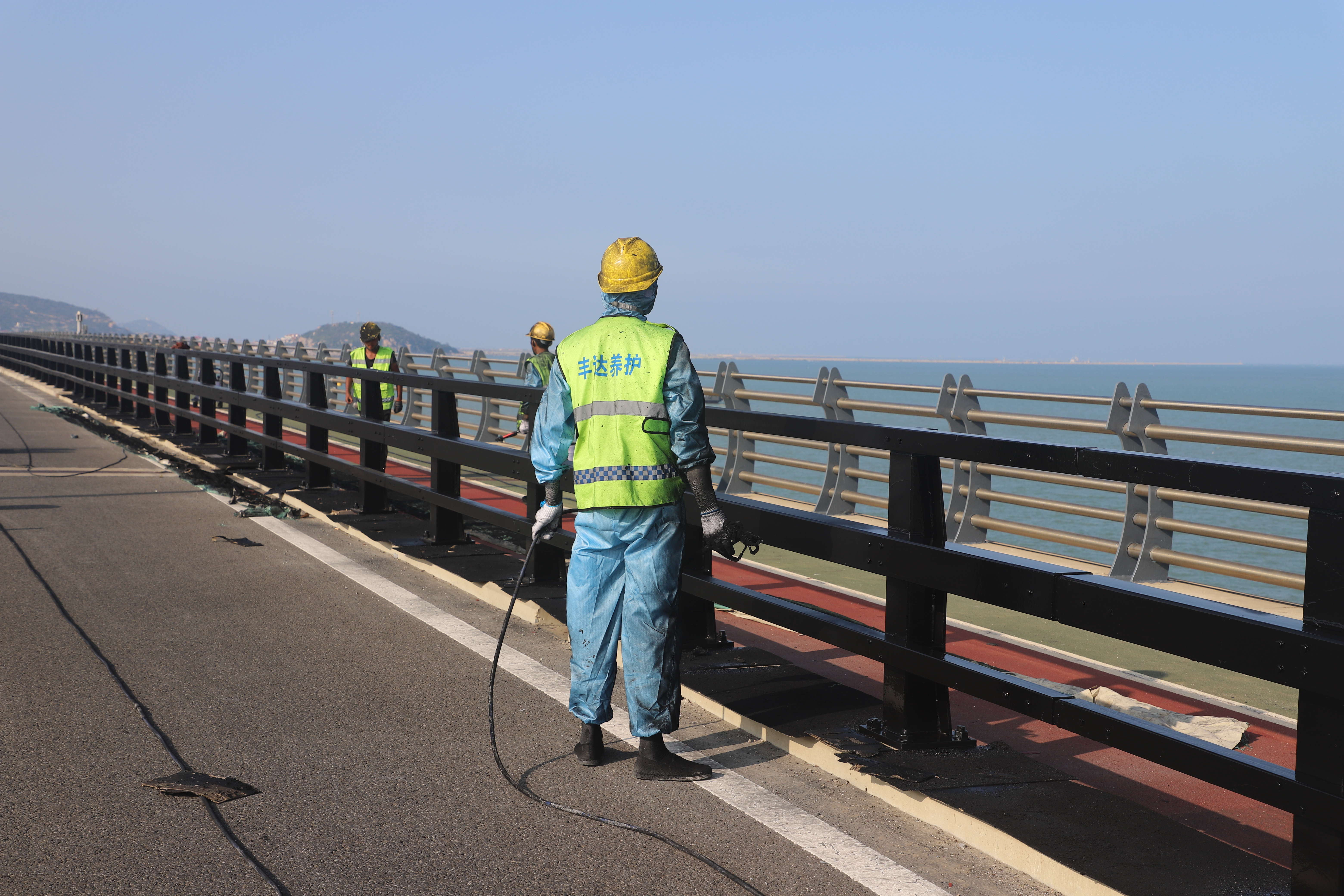 連云港海濱大道是一條彰顯港城山海相擁、港產(chǎn)城相融的濱海旅游觀光大道,該大道沿著連云港東海岸線貫穿南北,將連云港港口、產(chǎn)業(yè)、城區(qū)有機(jī)聯(lián)系在一起。該項(xiàng)目主要為跨海大橋防撞護(hù)欄進(jìn)行除銹出新,共完成油漆作業(yè)約36000m2、不銹鋼鋼管維修增設(shè)48米、橫縫焊接打磨102米、端頭封堵30個(gè)、南橋頭灌縫60米、原螺絲超長(zhǎng)切割處理13500根。