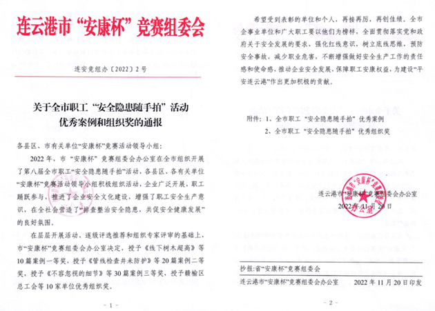 經(jīng)過(guò)市“安康杯”競(jìng)賽組委會(huì)專家評(píng)審,集團(tuán)權(quán)屬海建公司龔巖拍攝的《施工現(xiàn)場(chǎng)安全防護(hù)隱患》榮獲一等獎(jiǎng);海建公司朱勇拍攝的《洗沙設(shè)備傳動(dòng)裝置無(wú)防護(hù)》、豐達(dá)公司胡可陽(yáng)拍攝的《道路交通標(biāo)志牌傾斜》、公交集團(tuán)徐辛拍攝的《“平躺”的易爆品》、交通集團(tuán)趙州拍攝的《爬梯無(wú)護(hù)籠》榮獲二等獎(jiǎng);海建公司徐超拍攝的《出砂口缺少防護(hù)》、張杰拍攝的《圍堰內(nèi)通行爬梯不符合要求》、汽車公司郭磊拍攝的《消防栓水閥無(wú)法開啟》榮獲三等獎(jiǎng),集團(tuán)榮獲優(yōu)秀組織獎(jiǎng)。