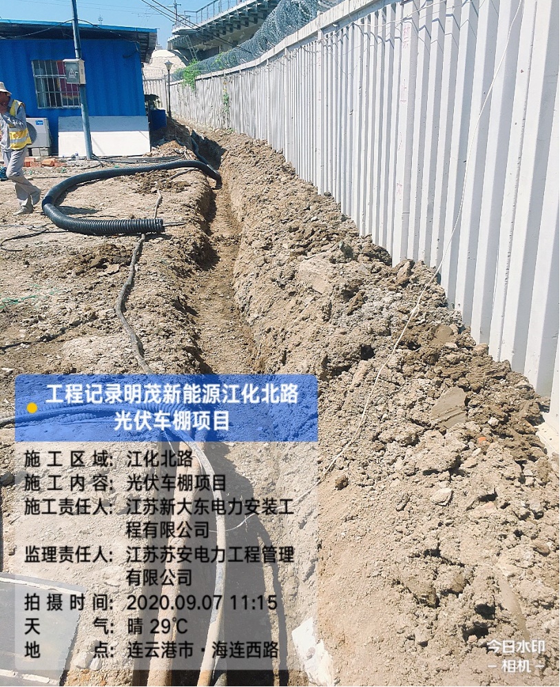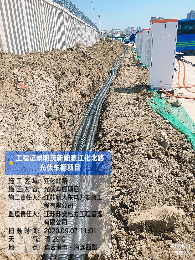 目前,江化北路光伏車棚項目已完成基礎施工正在進行電纜鋪設、車棚地基建設工作。本次施工共計建設4臺120KW直流充電樁和一座光伏車棚。