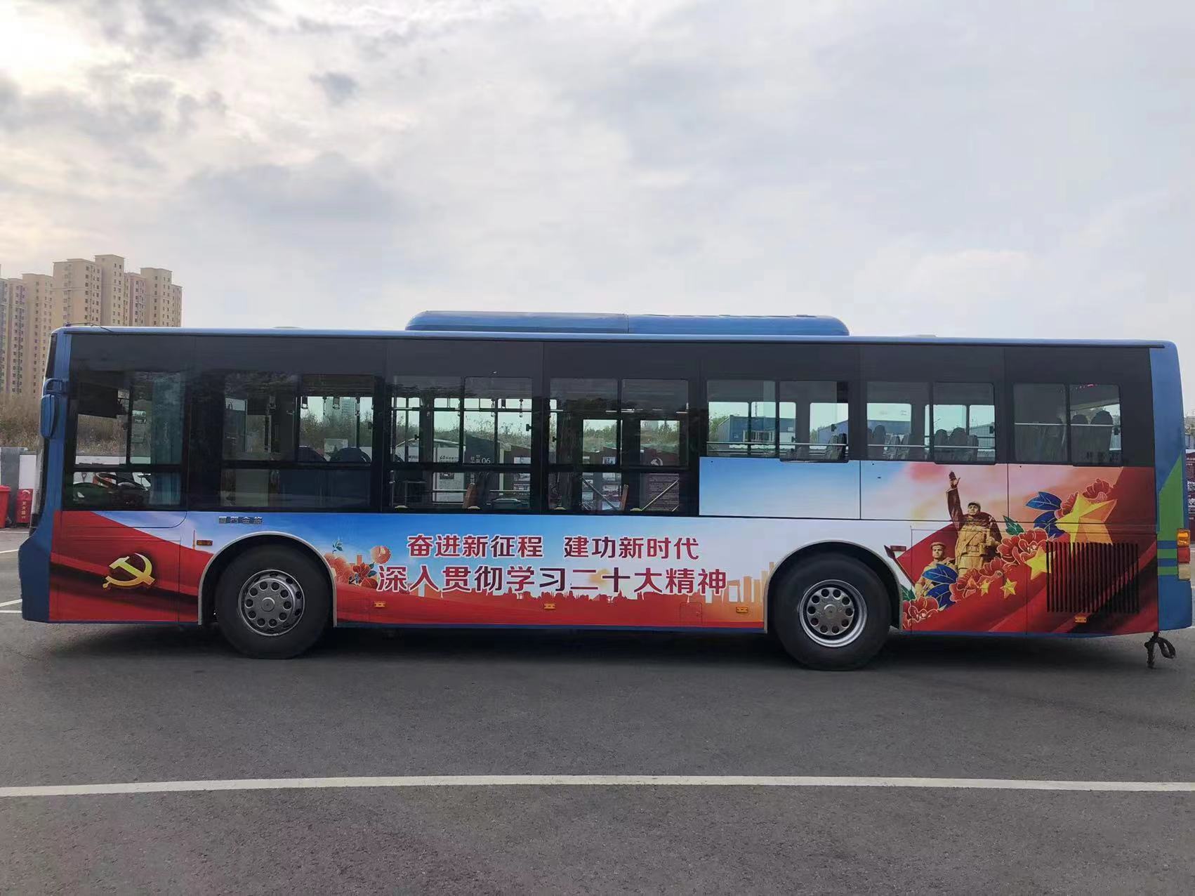 車身外觀,更新為以紅、藍(lán)色為主基調(diào),車身噴繪上“深入貫徹學(xué)習(xí)二十大精神”“奮進(jìn)新征程 建功新時(shí)代”等醒目的標(biāo)語,通過車輛每日運(yùn)行的方式穿梭于城市的大街小巷,增強(qiáng)社會(huì)宣傳受眾面,讓黨的理論“坐”上公交,走向社會(huì)。