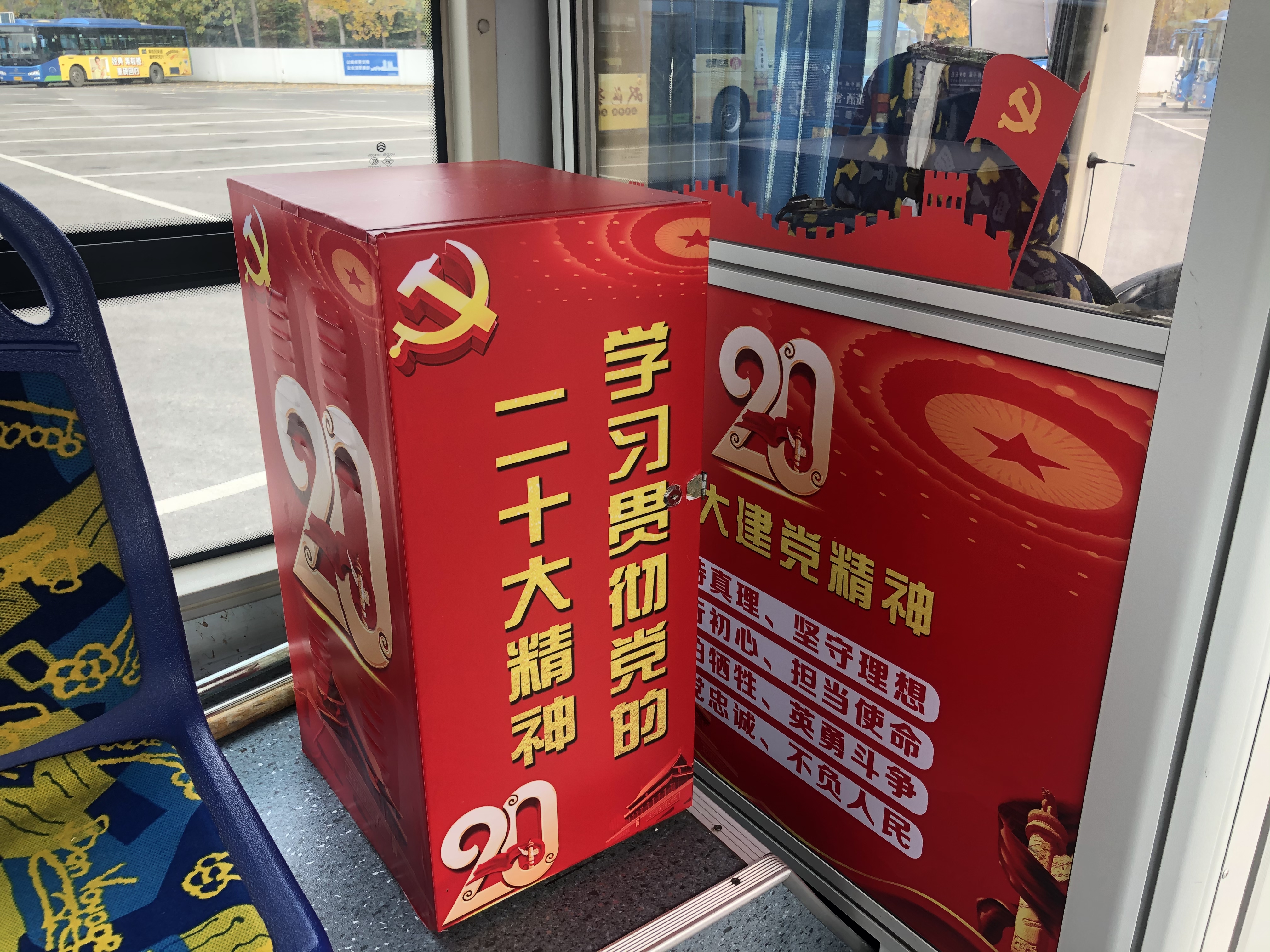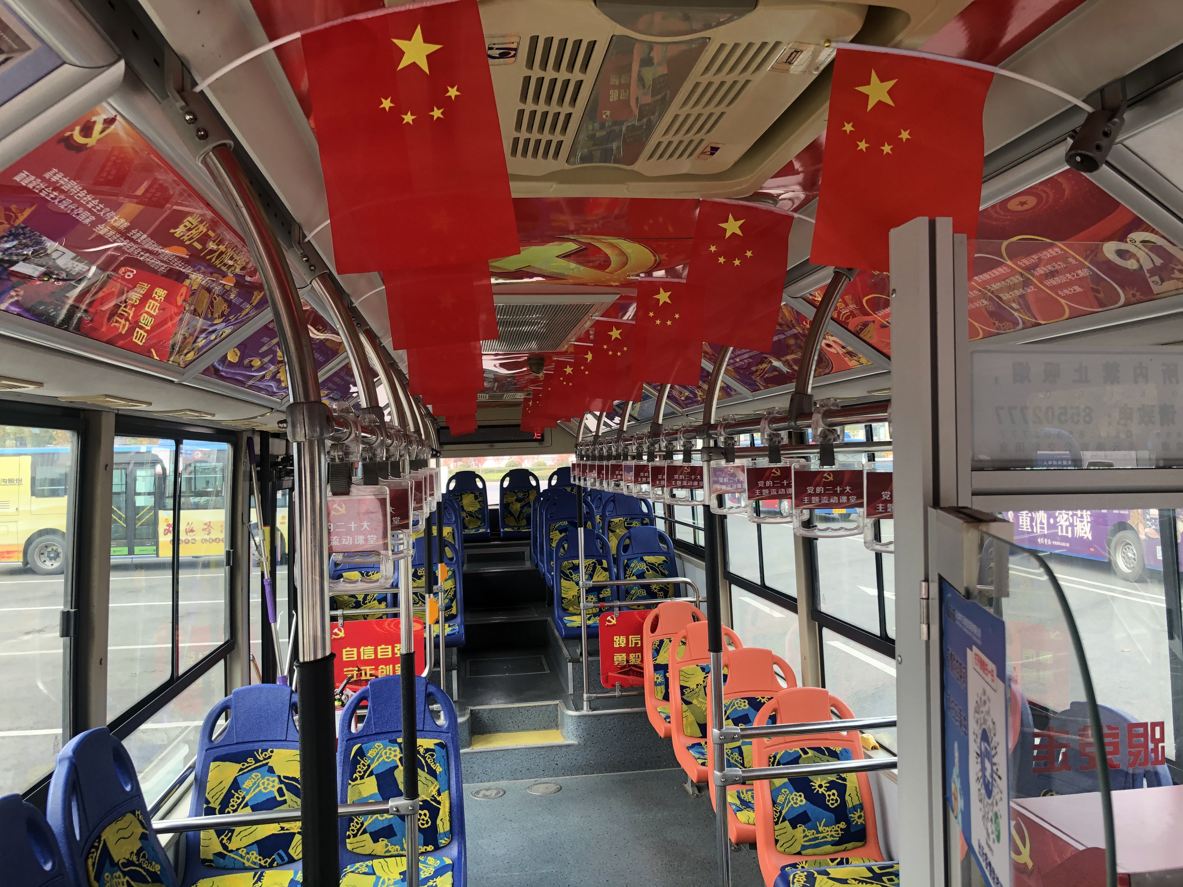 在暨2021年建黨百年“紅色黨史”主題車廂的基礎(chǔ)上,今年公交事業(yè)一部黨支部緊緊圍繞黨的二十大為宣傳主線,充分結(jié)合當(dāng)前工作實(shí)際,在持續(xù)深化黨史學(xué)習(xí)教育的同時(shí),以公交20路為紅色宣傳載體再發(fā)力,分別將車身廣告及車內(nèi)展板進(jìn)行更新升級(jí),以黨的二十大報(bào)告為主要宣傳內(nèi)容,打造了主題會(huì)議型車廂。