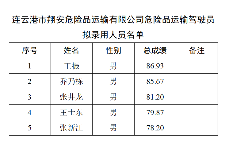 根據(jù)連云港市翔安危險(xiǎn)品運(yùn)輸有限公司危險(xiǎn)品運(yùn)輸駕駛員招聘公告有關(guān)規(guī)定和要求,現(xiàn)將本次招聘擬錄用人員名單予以公示。