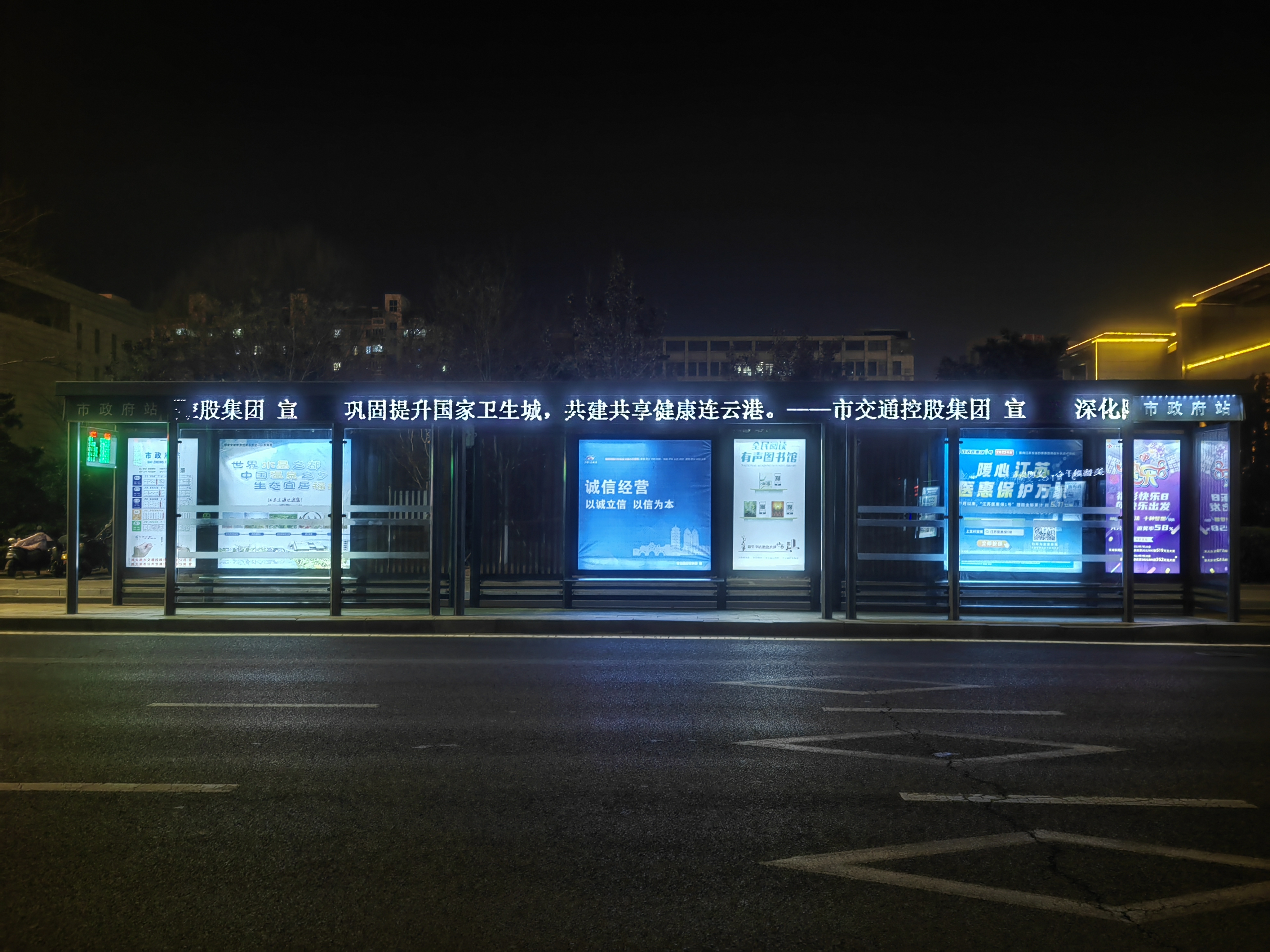 全市400余座公交站亭作為人流密集區(qū)域,成為此次社會面宣傳的任務(wù)重點(diǎn)。政府下達(dá)的相關(guān)文件中指出,為確保強(qiáng)化宣傳工作,“創(chuàng)衛(wèi)”內(nèi)容的可見度要廣泛至城區(qū)主次干道,其中包括臨街行人駐足大于2分鐘的LED顯示屏。交通集團(tuán)充分發(fā)揮自身宣傳優(yōu)勢,利用市區(qū)公交站亭的LED條屏等電子媒體,對本次創(chuàng)建衛(wèi)生城市的口號標(biāo)語進(jìn)行全天滾動播放。相關(guān)標(biāo)語的內(nèi)容為:“鞏固提升國家衛(wèi)生城,共建共享健康連云港”。