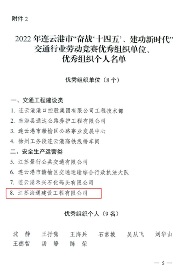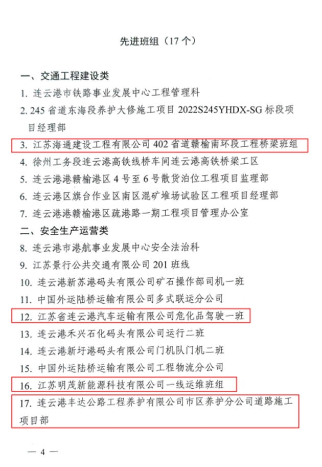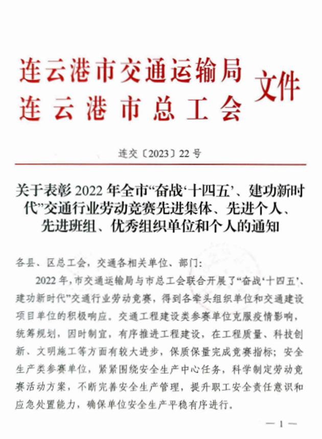 近日,從市總工會、市交通運輸局傳來喜訊,集團權(quán)屬公交集團公交事業(yè)一部榮獲2022年全市“奮戰(zhàn)十四五、建功新時代”交通行業(yè)勞動競賽先進集體,海建公司402省道贛榆南環(huán)段工程橋梁班組、汽車公司危化品駕駛一班、明茂新能源公司一線運維班組和豐達公司市區(qū)養(yǎng)護分公司道路施工項目部四個班組榮獲先進班組,公交集團周卓文被評為先進個人,海建公司被評為優(yōu)秀組織單位。