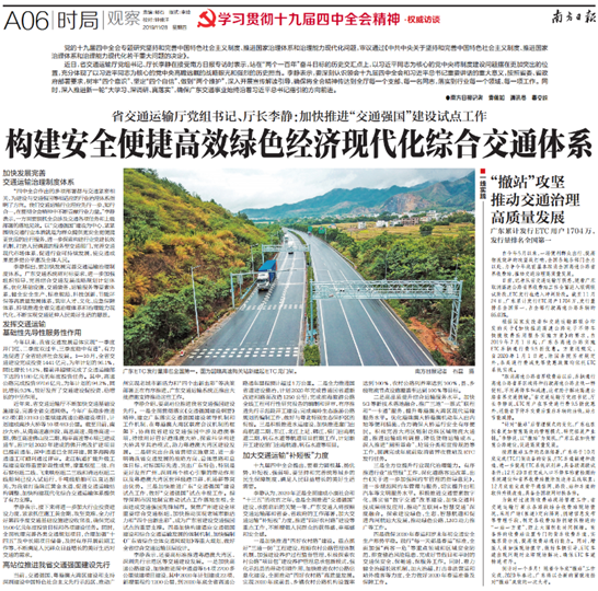 11 月28日,南方日?qǐng)?bào)A06版刊登了對(duì)省交通運(yùn)輸廳黨組書(shū)記、廳長(zhǎng)李靜的專訪報(bào)道。李靜表示,廣東交通系統(tǒng)將深刻認(rèn)識(shí)領(lǐng)會(huì)十九屆四中全會(huì)和習(xí)近平總書(shū)記重要講話的重大意義,按照省委、省政府部署要求,加快發(fā)展完善交通運(yùn)輸治理制度體系,高站位推進(jìn)我省交通強(qiáng)國(guó)建設(shè)先行,加大交通運(yùn)輸“補(bǔ)短板”力度,構(gòu)建安全便捷高效綠色經(jīng)濟(jì)的現(xiàn)代化綜合交通體系。報(bào)道詳情如下: