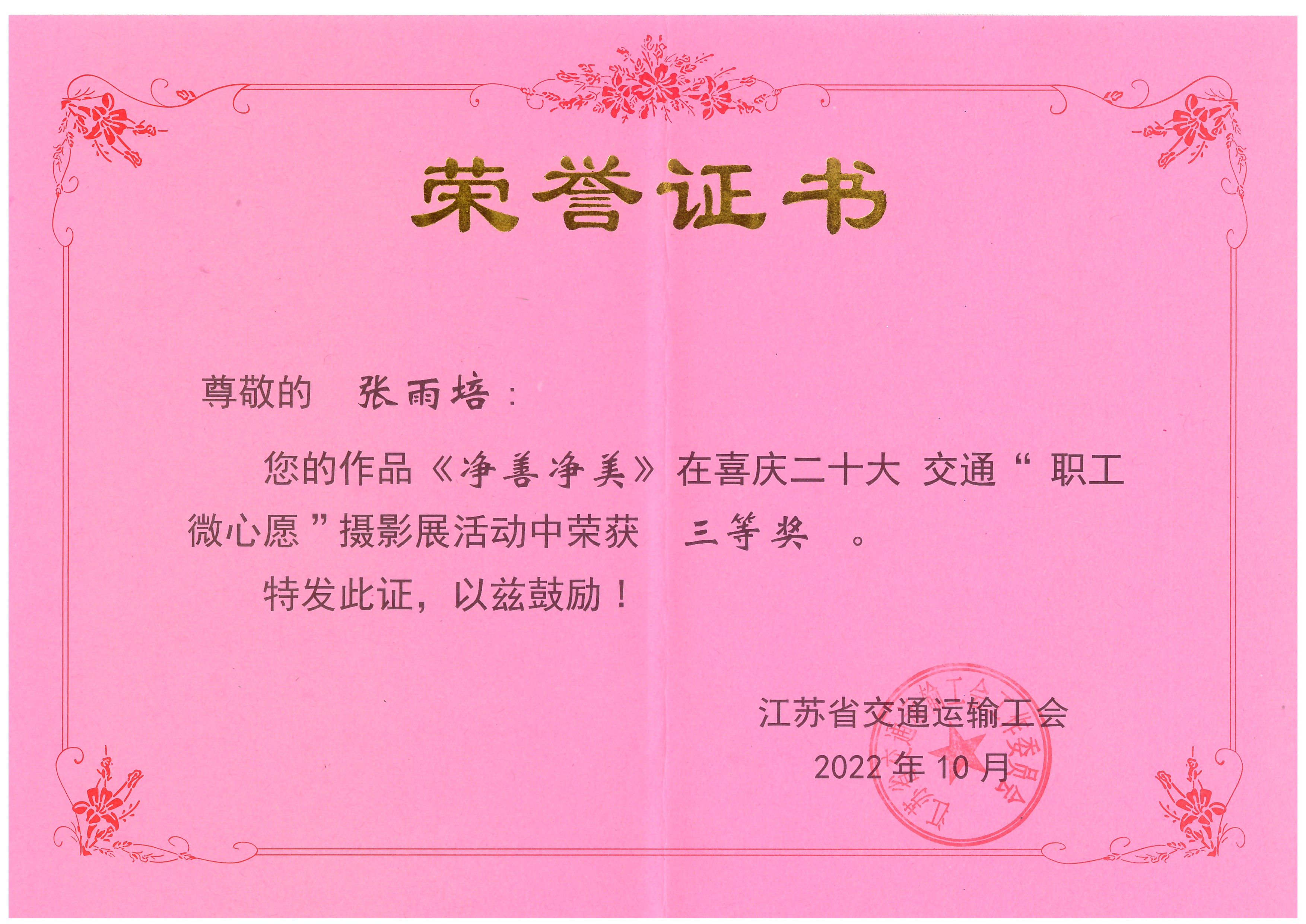 近日,從江蘇省交通運輸工會傳來喜訊,連云港市公交集團職工張雨培的攝影作品《凈善凈美》在喜慶二十大交通“職工微心愿”攝影展活動中榮獲“三等獎”。