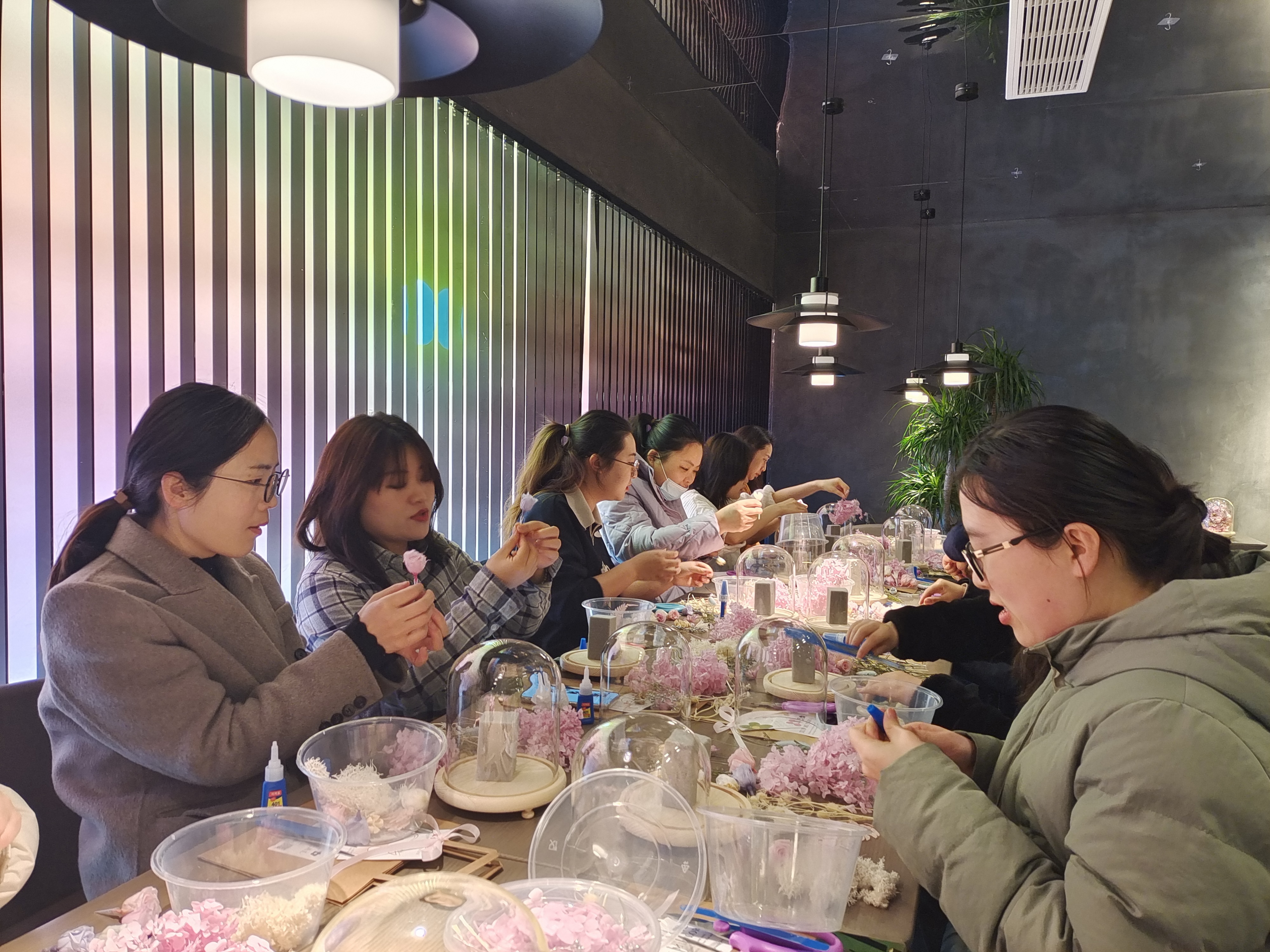 三月拂暖風(fēng),巾幗展笑顏。本次活動(dòng)以永生花藝學(xué)習(xí)的形式開(kāi)展,活動(dòng)伊始,老師講解了永生花插花的方法和技巧,為大家發(fā)放了永生花、剪刀、膠水及展示玻璃罩。隨后,女職工們便迫不及待地開(kāi)始了自己的創(chuàng)作之旅,各自小心翼翼地挑選著心儀的花材,精心設(shè)計(jì)配色,時(shí)不時(shí)相互交流心得,分享彼此收獲,指導(dǎo)老師也加入其中,為他們答疑解惑?;顒?dòng)現(xiàn)場(chǎng)笑語(yǔ)盈盈,在輕松愉快的氛圍中,一個(gè)個(gè)清新雅致而又獨(dú)具風(fēng)格的永生花作品在一雙雙靈巧的手中誕生。