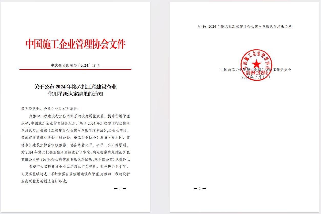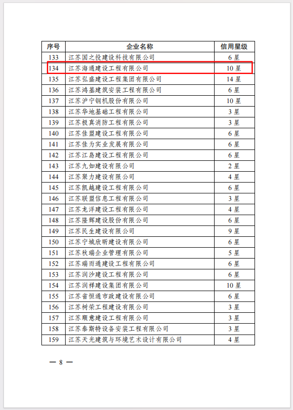 近日,從中國(guó)施工企業(yè)管理協(xié)會(huì)(簡(jiǎn)稱“中施企協(xié)”)獲悉,海建公司入選2024年第六批工程建設(shè)企業(yè)信用10星級(jí)認(rèn)定名單,較之22年再增2星。