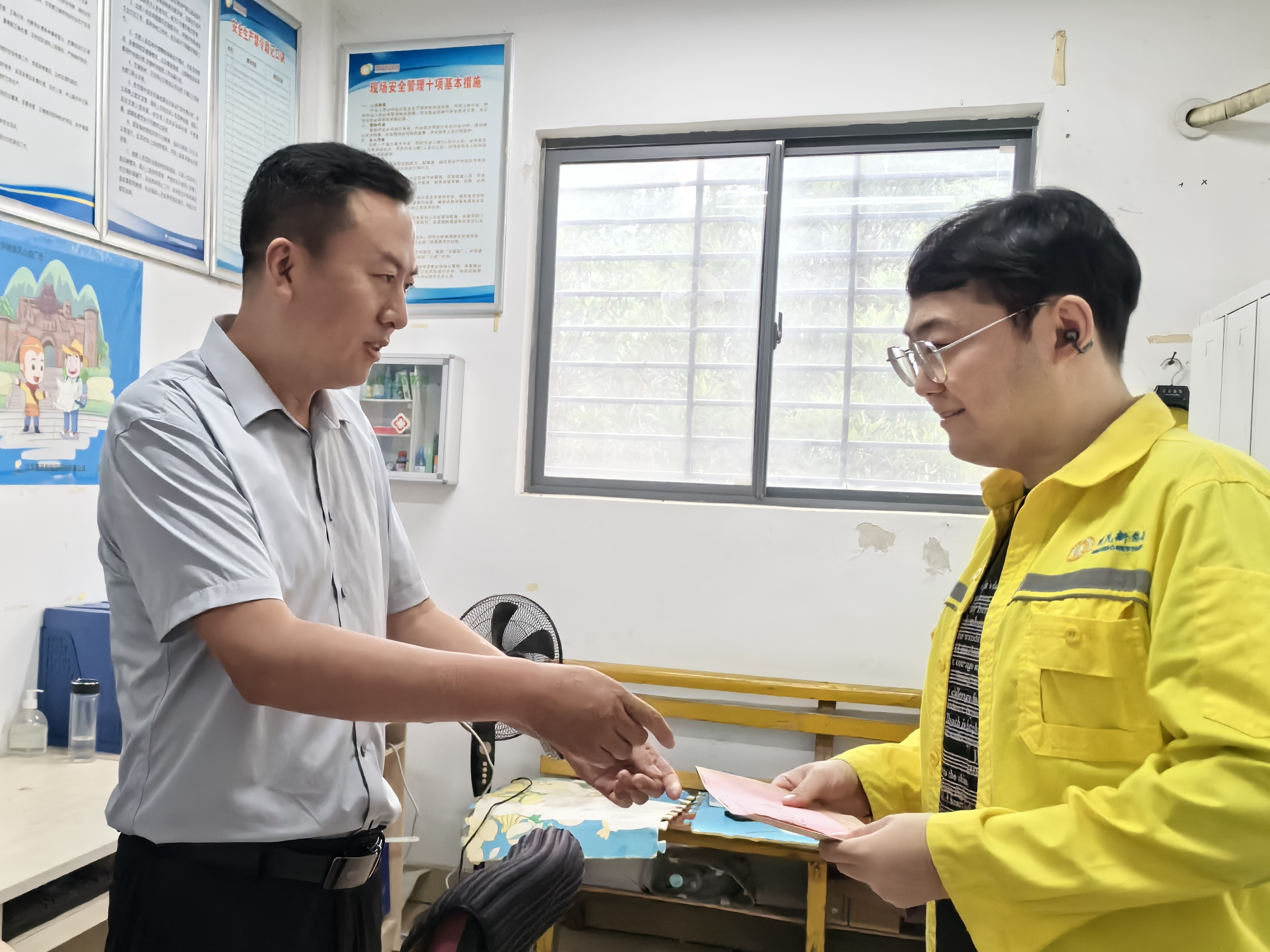 周輝一行首先前往中醫(yī)院,在病榻前探望了仍在住院治療的充電工孟憲強,關切地了解了他的恢復進展、治療方案及生活需求,送上了滿載祝福的慰問金和組織的殷切關懷。窗外雨聲淅瀝,病房內暖意融融。隨后,慰問組趕赴了黨校場站,探望了已返崗工作的充電工丁嵐清。周輝在丁嵐清的工位旁,細致詢問了他因貧血住院后的康復狀況及返崗后的身體適應情況,并親手送上慰問金,叮囑他務必保重身體,勞逸結合。一聲聲關切的叮囑,一句句暖心的鼓勵,讓丁嵐清、孟憲強深受感動,真切感受到“明茂大家庭”如家人般的溫暖。