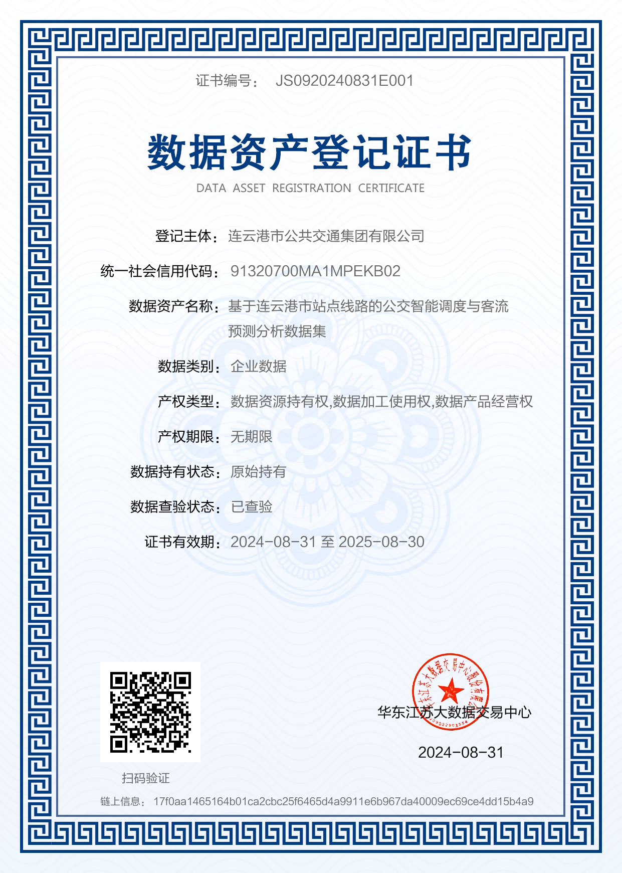 隨著數(shù)據(jù)資產(chǎn)確認(rèn)政策的正式落地,在連云港市國資委、市交通控股集團(tuán)有限公司的共同指導(dǎo)下,連云港市公共交通集團(tuán)有限公司先行先試、勇于探索,成功實現(xiàn)了連云港市首個數(shù)據(jù)資產(chǎn)價值化全流程項目的落地,這標(biāo)志著連云港市公交集團(tuán)在數(shù)據(jù)資產(chǎn)化領(lǐng)域的先行一步,更為全市國有企業(yè)在數(shù)字資產(chǎn)化以及數(shù)字化轉(zhuǎn)型的道路上樹立了新的標(biāo)桿。