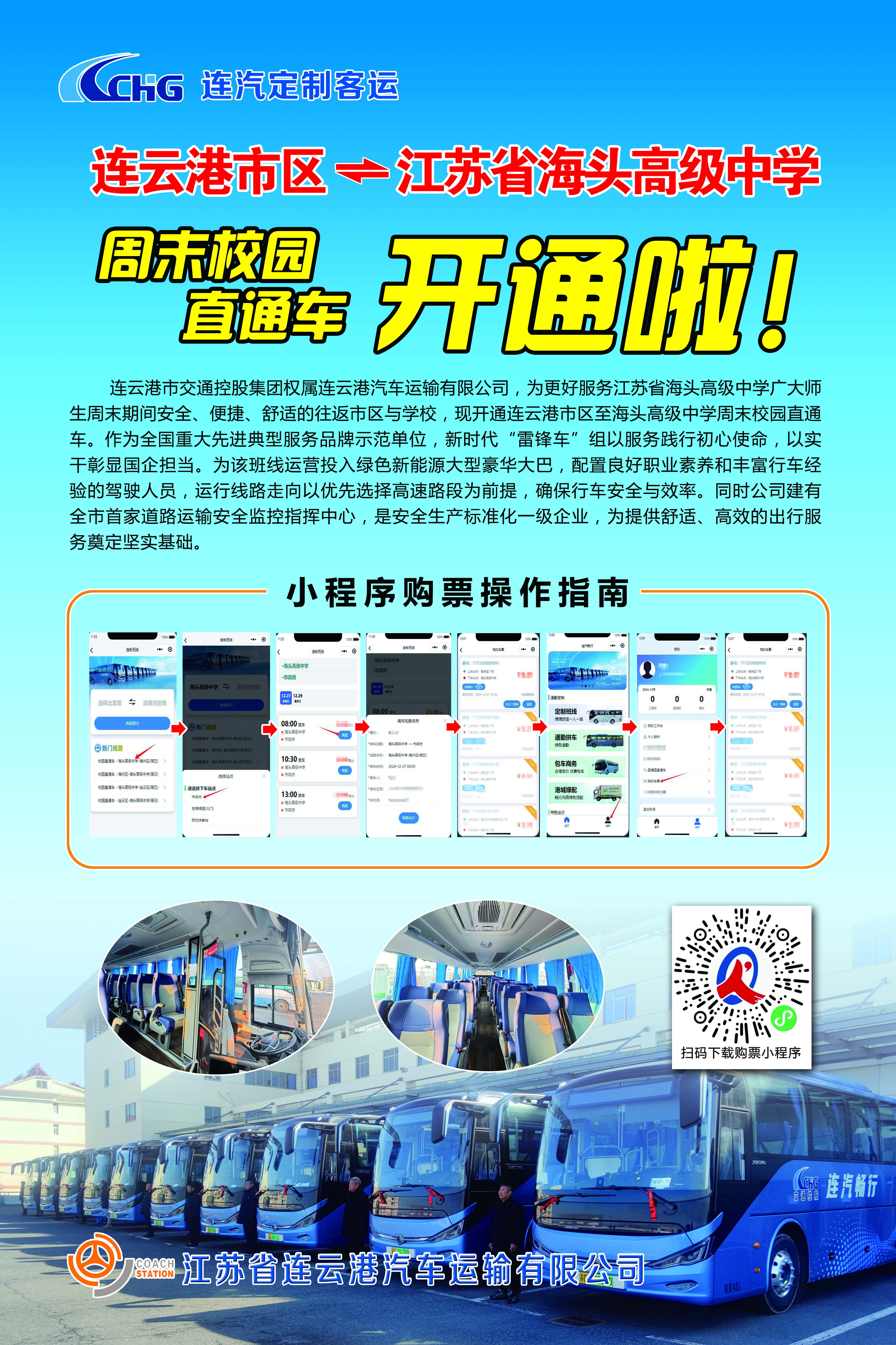 為更好地服務(wù)江蘇省海頭高級(jí)中學(xué)廣大師生,連汽定制客運(yùn)事業(yè)部定于1227日,開通連云港市區(qū)至海頭高級(jí)中學(xué)周末校園直通車。這一舉措旨在確保師生們?cè)谥苣┢陂g能夠安全、便捷、舒適地往返市區(qū)與學(xué)校。