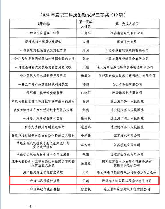 為全面落實習(xí)近平總書記關(guān)于科技創(chuàng)新的重要指示要求,連云港市總工會緊扣《新時代連云港產(chǎn)業(yè)工人隊伍建設(shè)改革實施方案》,在全市職工中征集科技創(chuàng)新成果和先進操作法。經(jīng)個人申報、單位推薦、專家評審、媒體公示,認(rèn)定和表彰33項操作法為“2024年度連云港市職工科技創(chuàng)新成果”。公司職工王越申報的“一種施工風(fēng)險監(jiān)控裝置”獲市職工科技創(chuàng)新成果三等獎。