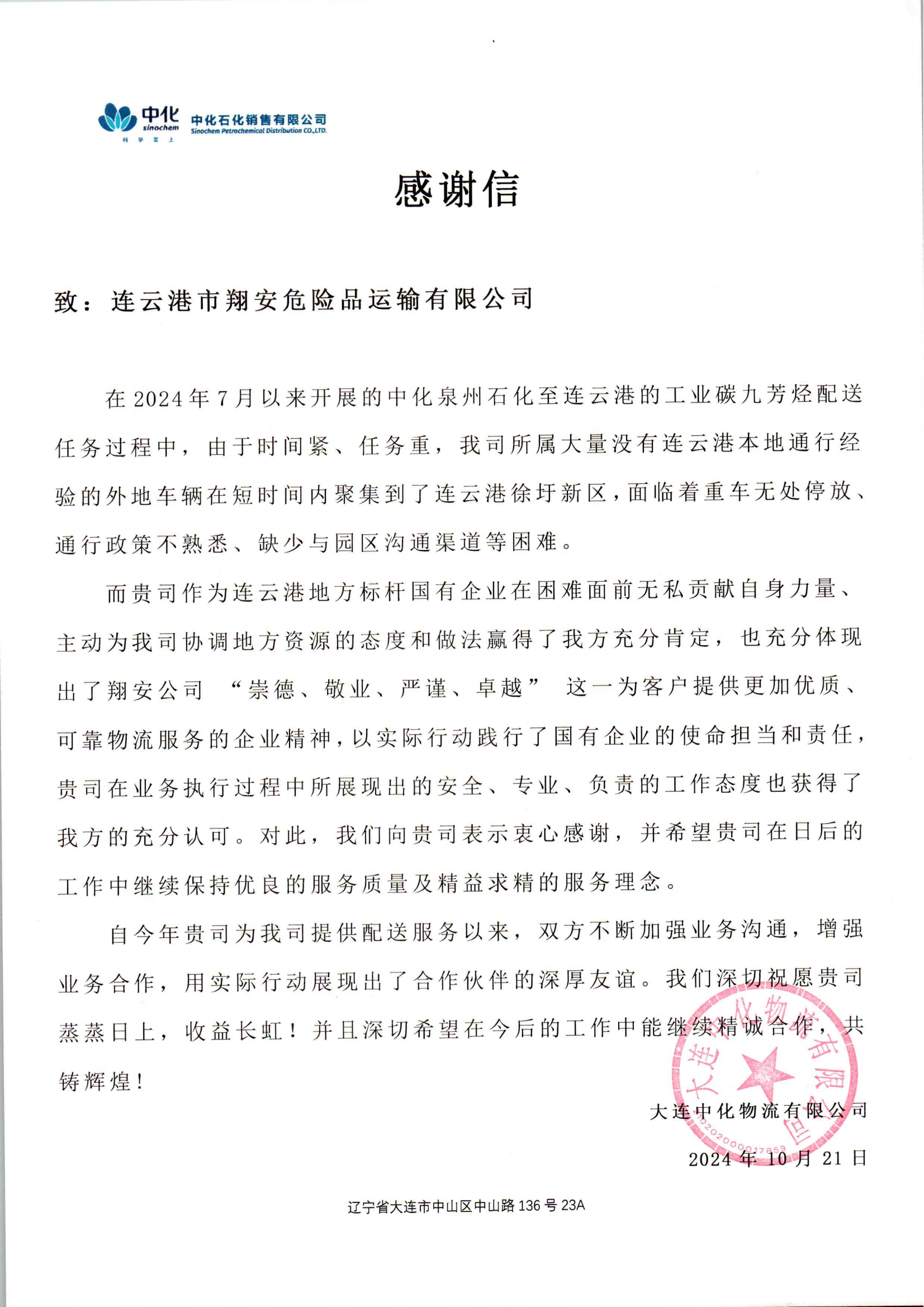 10月28日,連汽翔安危險(xiǎn)品運(yùn)輸有限公司收到了大連中化物流有限公司的一封感謝信。信中對(duì)翔安公司為大連中化物流有限公司在連云港業(yè)務(wù)的順利開展所提供的支持和服務(wù)表示了由衷的贊賞和感謝。