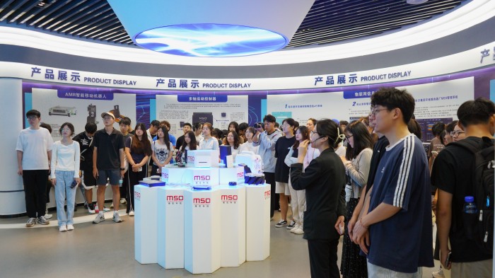 大學(xué)生們首先參觀了海宏科技展廳,工作人員以展廳背景墻上的十二個字“智能改變世界 創(chuàng)新引領(lǐng)未來”為切入點,逐一介紹了公司的發(fā)展歷程、主要產(chǎn)品、工業(yè)物聯(lián)網(wǎng)及移動機器人、智能制造、高速數(shù)控凹版印花等內(nèi)容。學(xué)子們紛紛圍繞在展品周圍,認(rèn)真聆聽講解,并不時提出自己的疑問和見解,與講解員進行熱烈的互動。有的同學(xué)圍繞自己的學(xué)習(xí)專業(yè)和對智能制造行業(yè)的認(rèn)知與工作人員積極交流,就企業(yè)對大學(xué)生的專業(yè)需求,以及未來的學(xué)習(xí)成長、就業(yè)規(guī)劃等問題有了更深刻地理解。