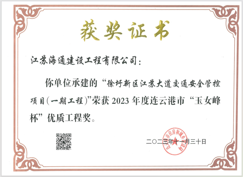 近日,從連云港住房和城鄉(xiāng)建設(shè)局獲悉,江蘇海建公司徐圩新區(qū)江蘇大道交通安全管控項(xiàng)目(一期工程)榮獲2023年度連云港市“玉女峰杯”優(yōu)質(zhì)工程獎。