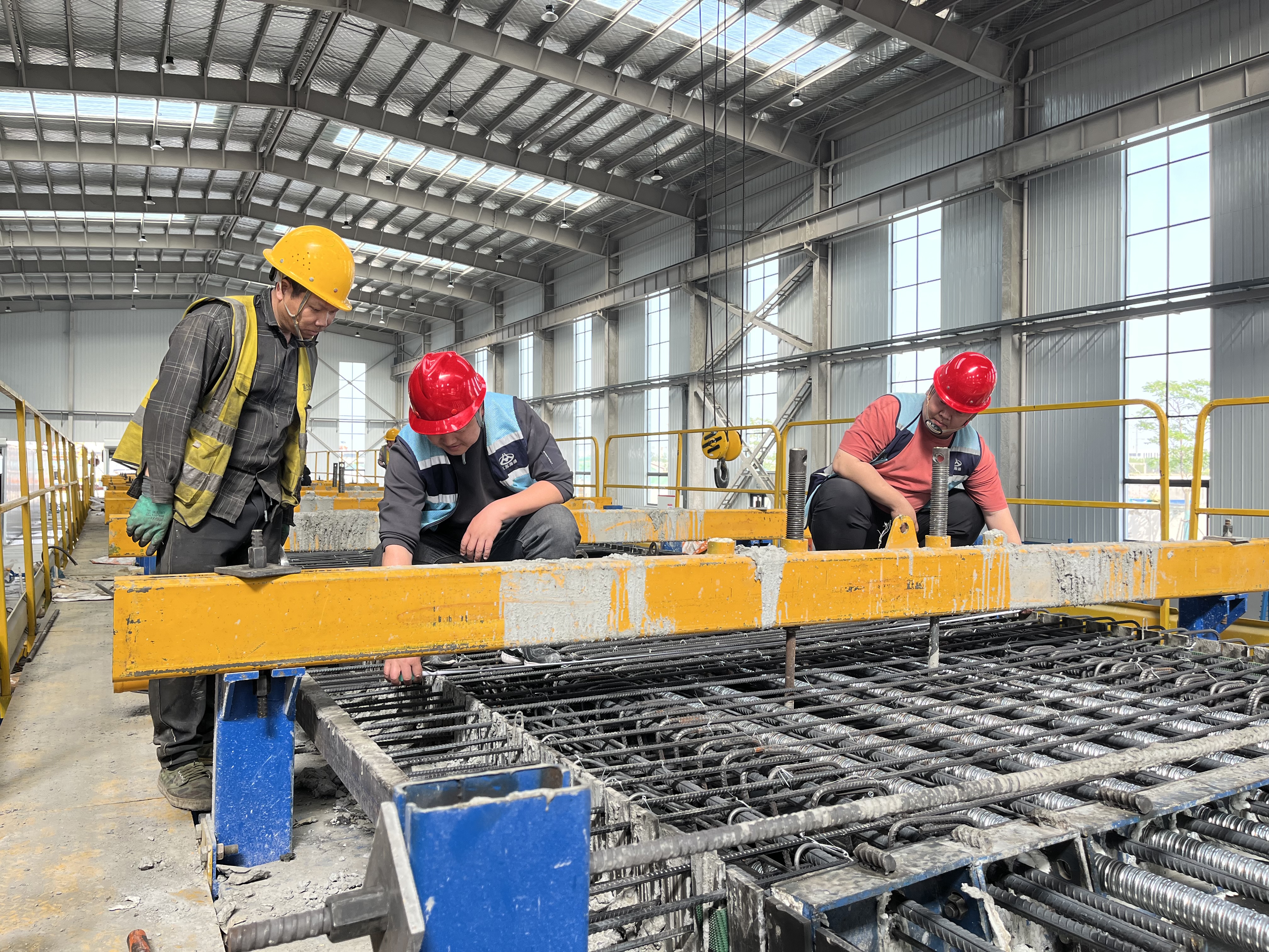 預(yù)制梁廠車間:精密制造,澆筑橋梁“脊梁”。與此同時(shí),通仁分公司預(yù)制梁廠內(nèi)同樣是一派繁忙景象。鋼筋加工區(qū)火花四濺,數(shù)控設(shè)備精準(zhǔn)切割、彎折鋼筋;澆筑區(qū)里,混凝土泵車與布料機(jī)默契配合,將混凝土精準(zhǔn)注入模具;養(yǎng)護(hù)區(qū)內(nèi),噴淋系統(tǒng)定時(shí)運(yùn)作,為預(yù)制梁提供最佳養(yǎng)護(hù)環(huán)境。預(yù)制廠事業(yè)部副經(jīng)理王道義對(duì)生產(chǎn)的鋼筋骨架間距、梁體內(nèi)部結(jié)構(gòu)、梁上斷面尺寸進(jìn)行仔細(xì)排查,他們說(shuō):“每片梁都是橋梁的‘脊梁’,必須確保零缺陷?!?/span>