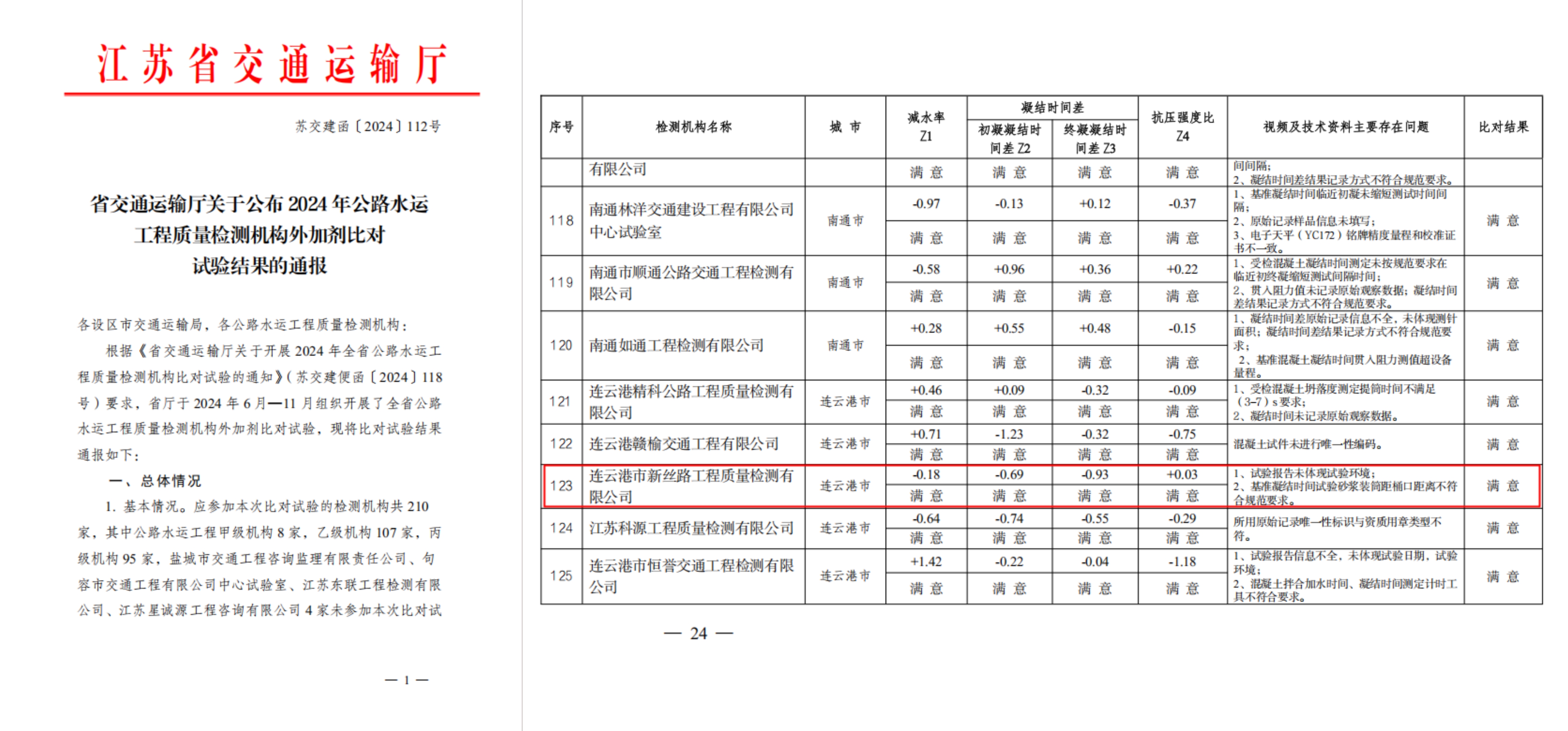 根據(jù)《省交通運(yùn)輸廳關(guān)于開(kāi)展 2024 年全省公路水運(yùn)工程質(zhì)量檢測(cè)機(jī)構(gòu)比對(duì)試驗(yàn)的通知》(蘇交建便函〔2024〕118號(hào))要求,省廳于2024年6月—11月組織開(kāi)展全省公路水運(yùn)工程質(zhì)量檢測(cè)機(jī)構(gòu)外加劑比對(duì)試驗(yàn)。近日,蘇交建函〔2024〕112號(hào)發(fā)文通報(bào),江蘇海建新絲路公司在2024 年全省公路水運(yùn)工程質(zhì)量檢測(cè)機(jī)構(gòu)比對(duì)試驗(yàn)中所獲比對(duì)結(jié)果為“滿意”,順利通過(guò)此次比對(duì)實(shí)驗(yàn)。