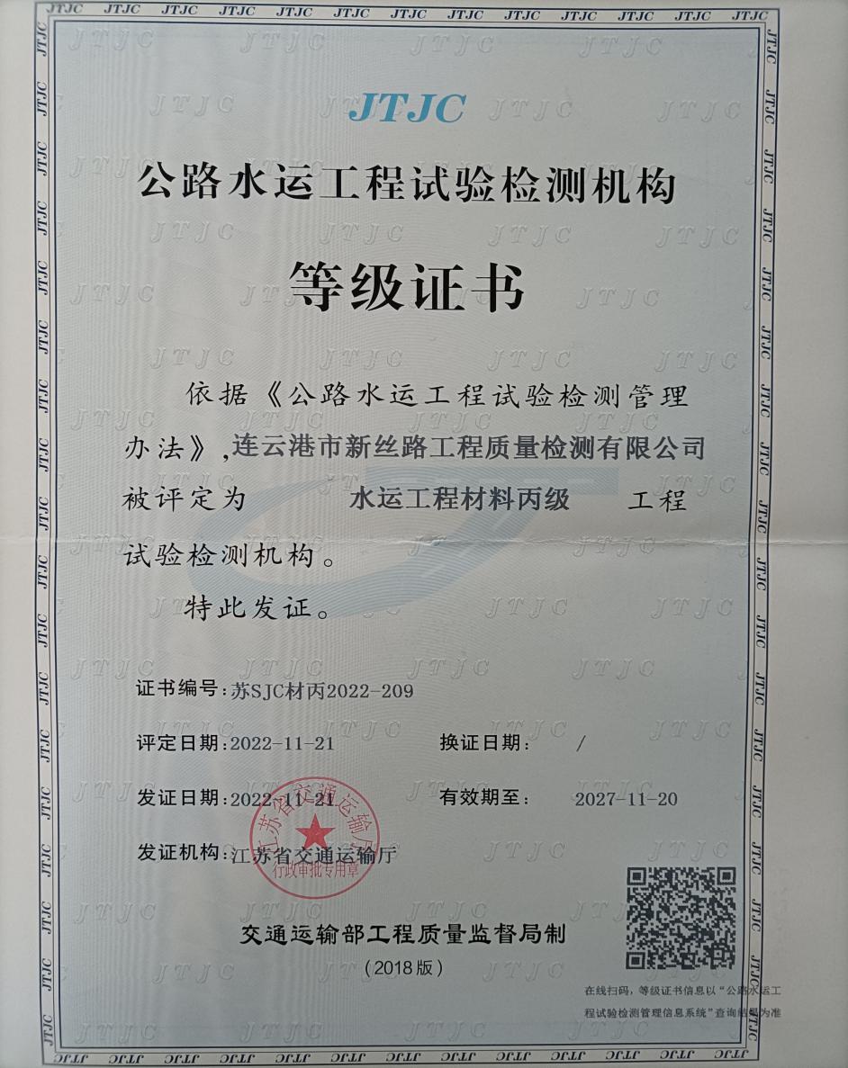 近日,江蘇海建新絲路檢測公司水運(yùn)工程材料試驗(yàn)檢測資質(zhì),經(jīng)江蘇省交通運(yùn)輸廳核準(zhǔn),申報(bào)成功并取得證書。