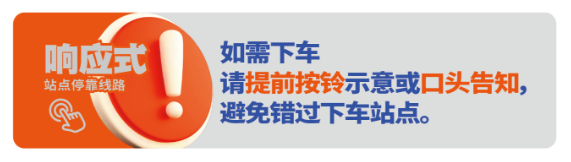 “響應(yīng)式公交”是指線路不再執(zhí)行“逢站必?!?,車輛到站前,要下車的乘客需提前按鈴示意或口頭告知駕駛員。如無乘客按鈴或口頭告知下車,并且??空緝?nèi)無乘客等候、無其他公交車停靠時(shí),將減速越站通過。
