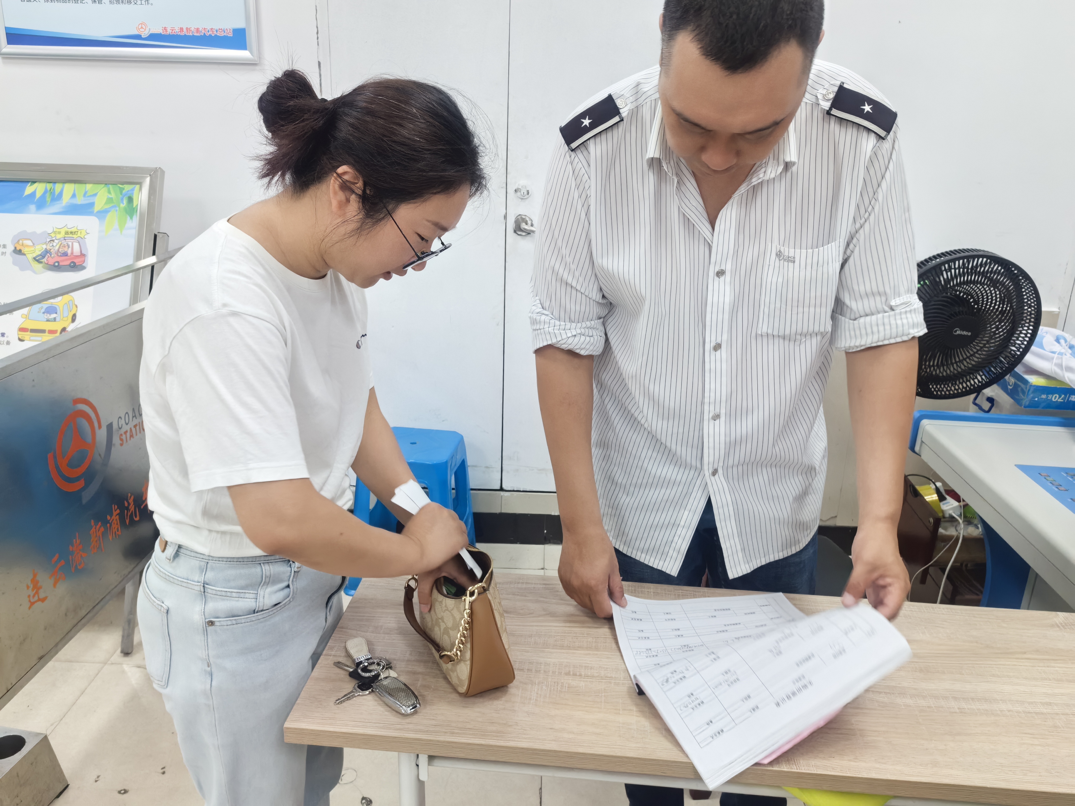 當(dāng)日下午,王建國(guó)駕駛機(jī)場(chǎng)巴士從花果山機(jī)場(chǎng)發(fā)往市區(qū),抵達(dá)新浦汽車總站后,按照慣例對(duì)車廂進(jìn)行清潔。在整理后排座位時(shí),他發(fā)現(xiàn)一個(gè)手提包遺落在座位上,此時(shí)旅客已全部下車離開。王建國(guó)第一時(shí)間檢查物品,發(fā)現(xiàn)包內(nèi)有現(xiàn)金若干、個(gè)人身份證件和銀行卡等重要個(gè)人物品,他立即將手提包送至總站“雷鋒車”組服務(wù)臺(tái),交由工作人員登記保管。
