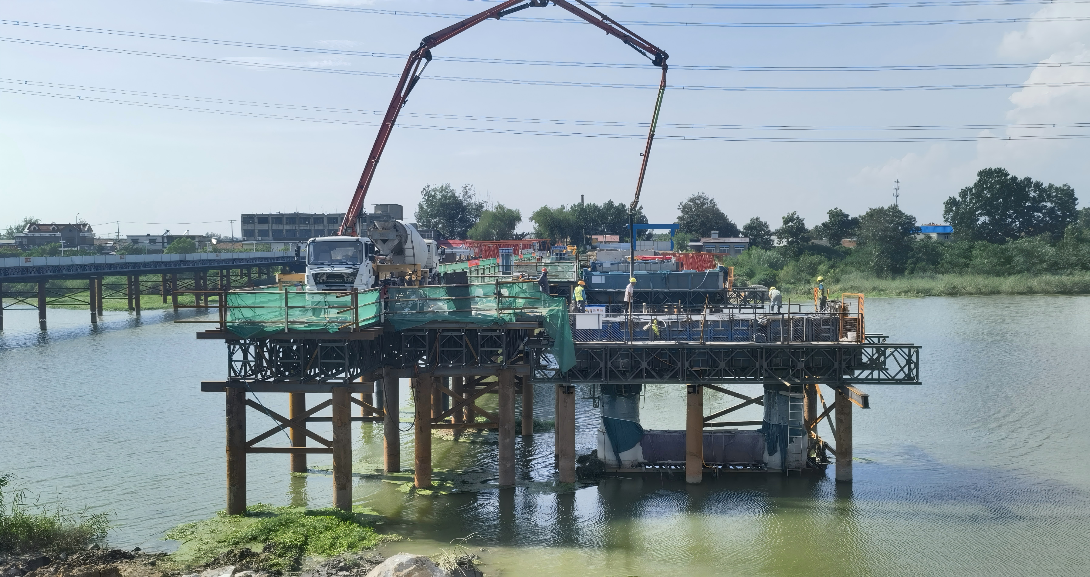 該五跨橋梁全長210米,橫跨薔薇河,是作為薔薇河上的重要通道、老海州城區(qū)對外出行通道的重要交通樞紐。為確保水上蓋梁施工的安全與精度,項(xiàng)目部科學(xué)組織、精益管理,克服深水作業(yè)、汛期影響、通航壓力等多重挑戰(zhàn)。全體建設(shè)者發(fā)揚(yáng)連續(xù)作戰(zhàn)的精神,搶抓枯水期等有利時(shí)機(jī),晝夜輪班,最終安全、優(yōu)質(zhì)、高效地完成全部水上蓋梁的澆筑任務(wù),各項(xiàng)技術(shù)指標(biāo)均符合設(shè)計(jì)規(guī)范要求。現(xiàn)場項(xiàng)目負(fù)責(zé)人周宇寬表示:“水上蓋梁的全部完工,意味著大橋的‘水中骨架’已經(jīng)牢牢筑就。接下來,項(xiàng)目部將全力以赴轉(zhuǎn)入T梁架設(shè)及橋面系施工階段,我們有信心按期實(shí)現(xiàn)全橋合攏的目標(biāo)?!?/span>