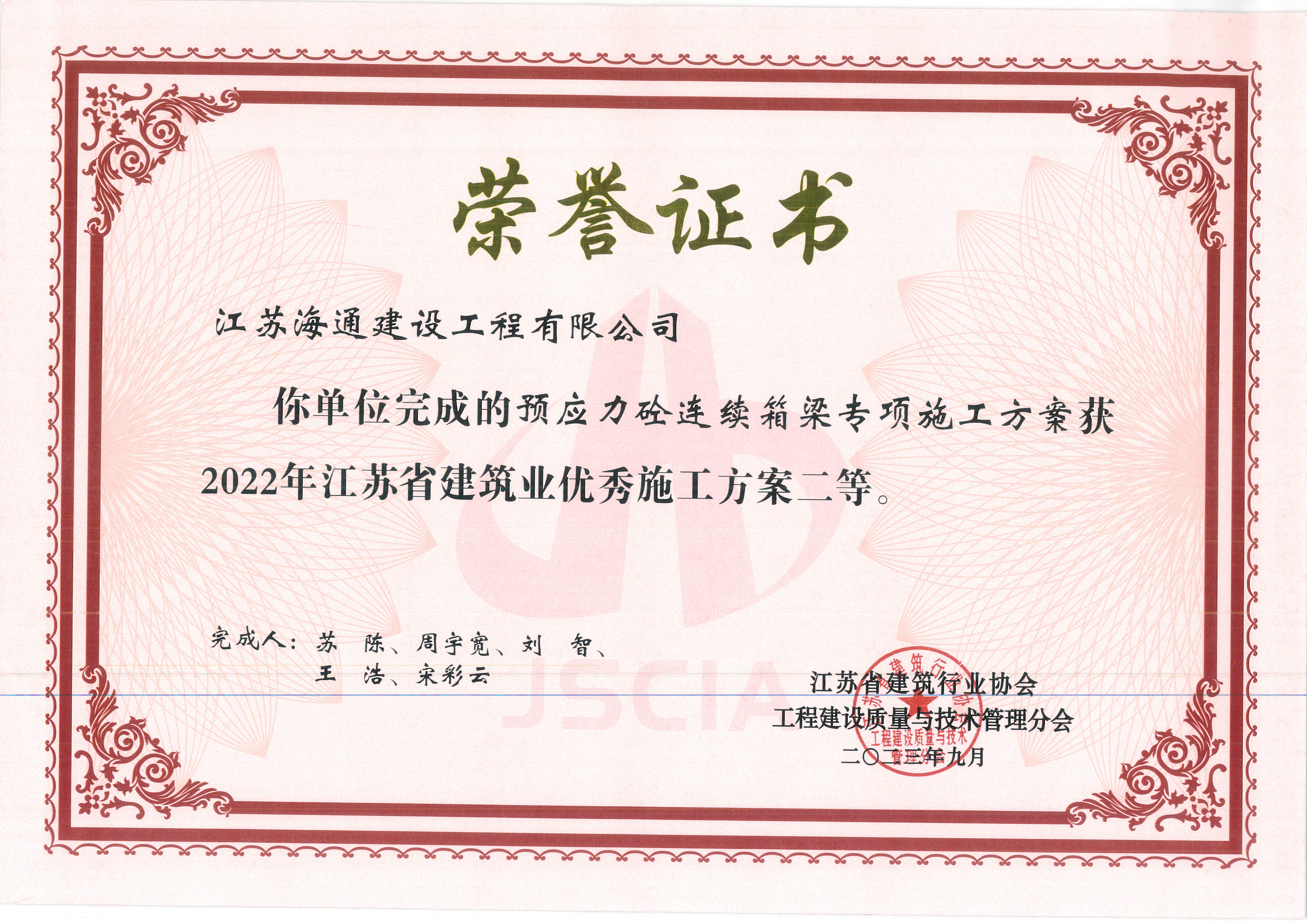 日前,從江蘇省建筑業(yè)協(xié)會獲悉,江蘇海建公司申報的《預(yù)應(yīng)力砼連續(xù)箱梁專項施工方案》和《二沉池、生物反應(yīng)池基坑工程基坑支護(hù)工程土方開挖專項方案》兩項施工方案分獲江蘇省建筑業(yè)優(yōu)秀施工方案二等獎和三等獎。