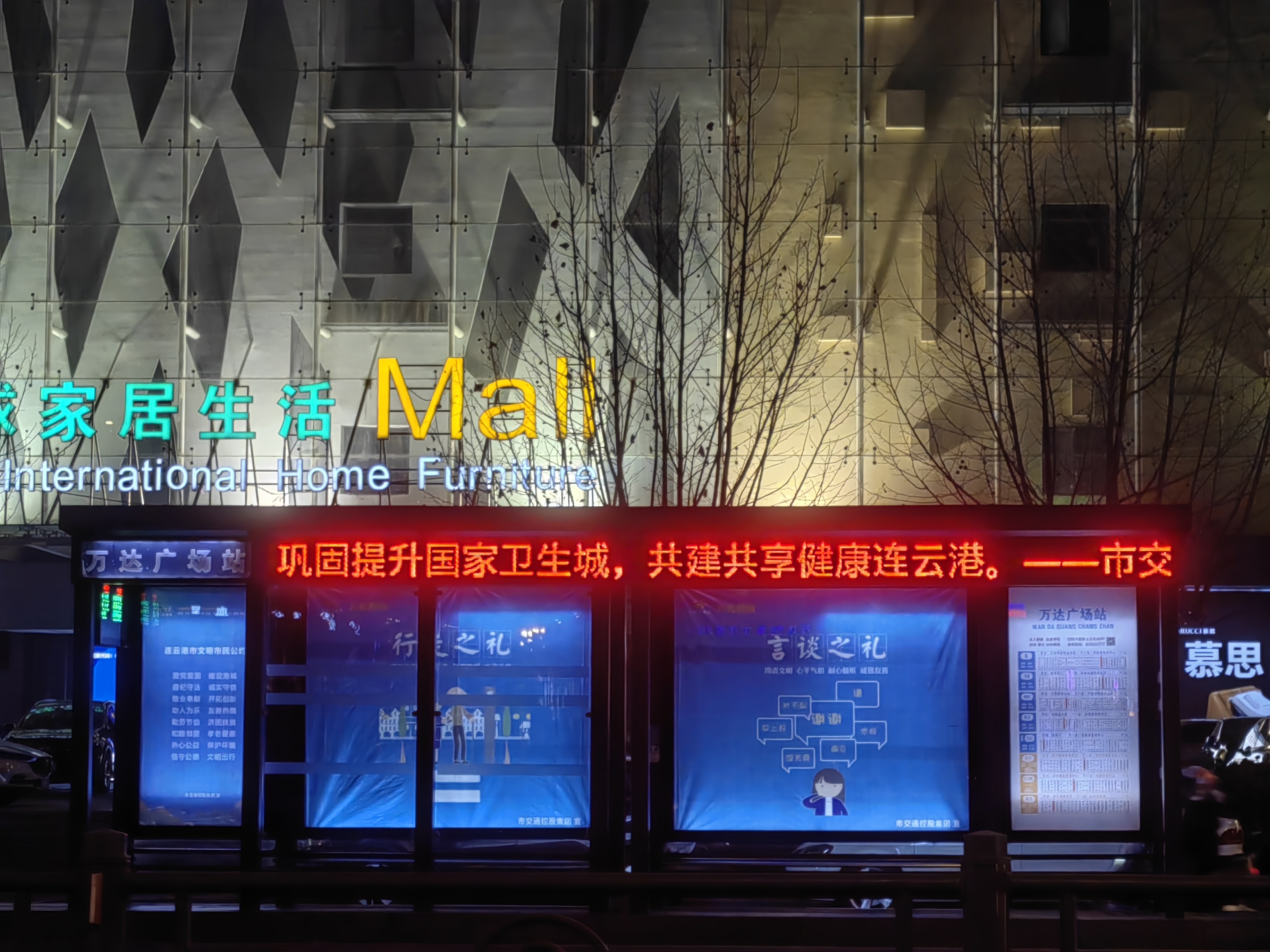 全市400余座公交站亭作為人流密集區(qū)域,成為此次社會面宣傳的任務(wù)重點(diǎn)。政府下達(dá)的相關(guān)文件中指出,為確保強(qiáng)化宣傳工作,“創(chuàng)衛(wèi)”內(nèi)容的可見度要廣泛至城區(qū)主次干道,其中包括臨街行人駐足大于2分鐘的LED顯示屏。交通集團(tuán)充分發(fā)揮自身宣傳優(yōu)勢,利用市區(qū)公交站亭的LED條屏等電子媒體,對本次創(chuàng)建衛(wèi)生城市的口號標(biāo)語進(jìn)行全天滾動播放。相關(guān)標(biāo)語的內(nèi)容為:“鞏固提升國家衛(wèi)生城,共建共享健康連云港”。