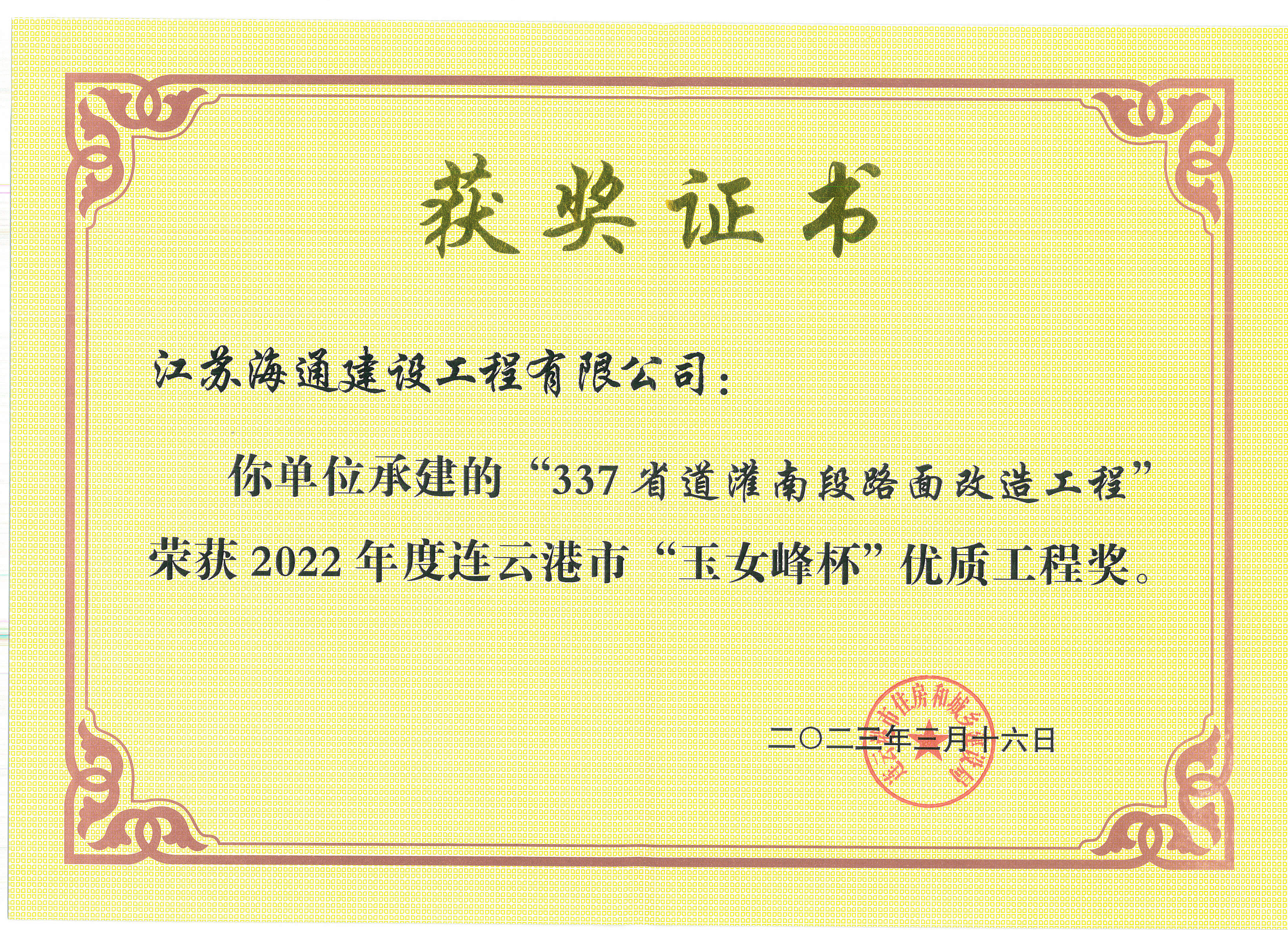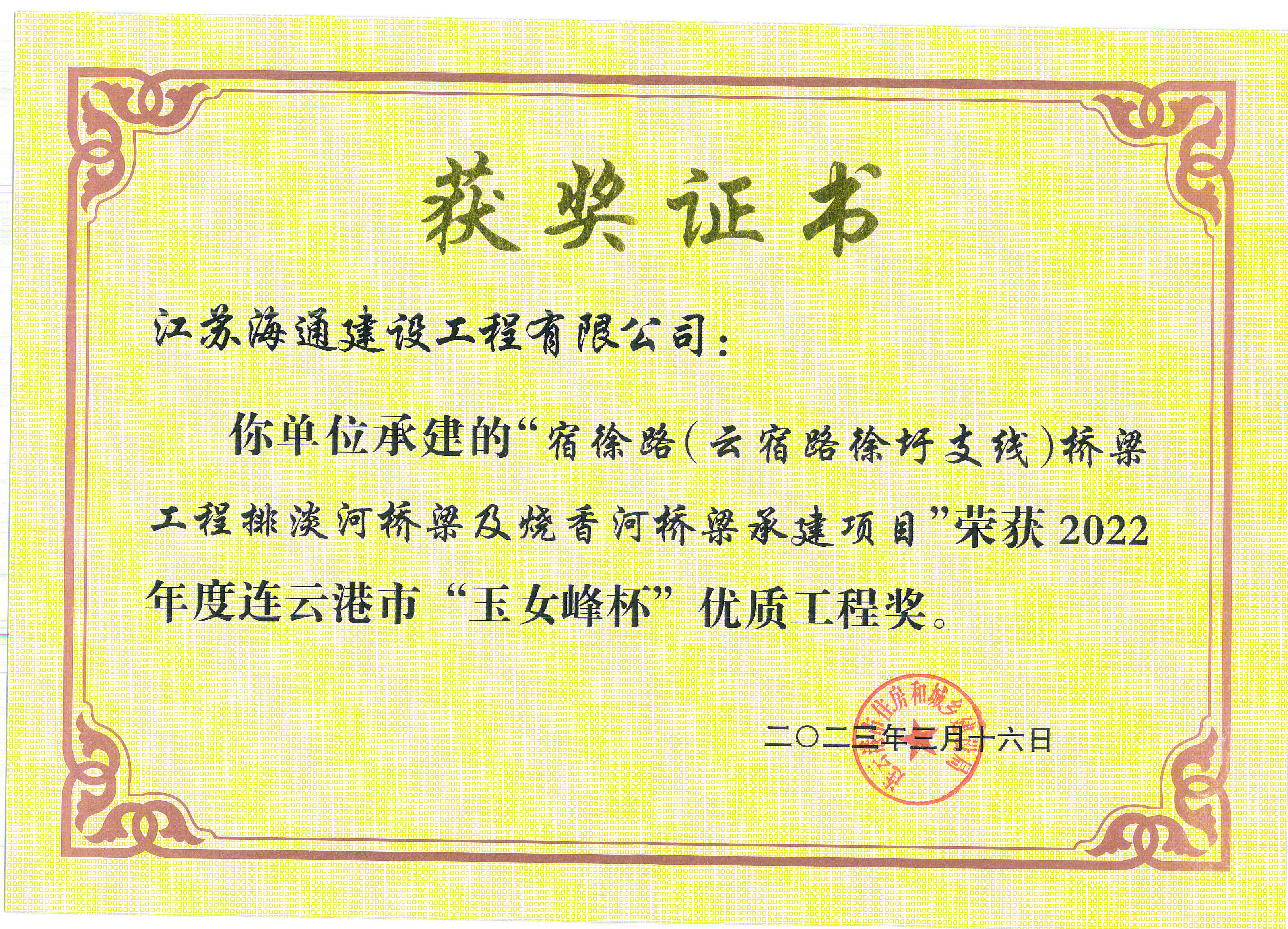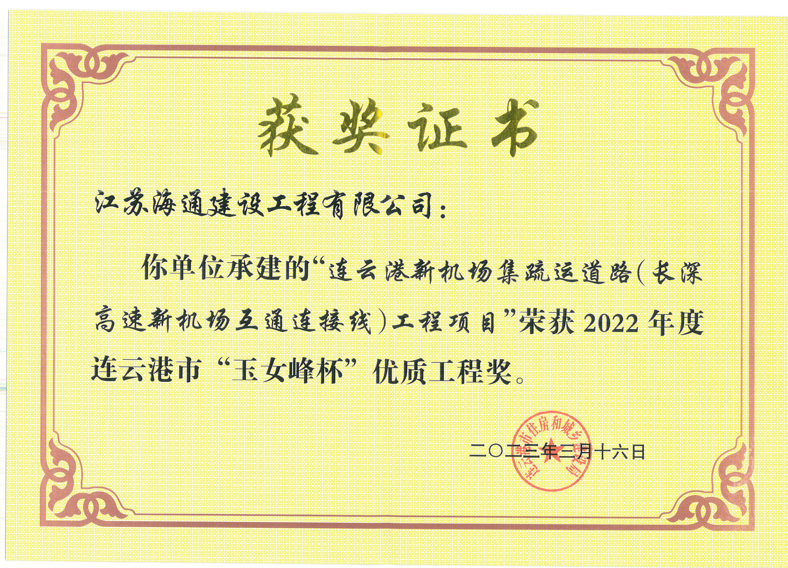 近日,從連云港市住房和城鄉(xiāng)建設(shè)局獲悉,由江蘇海建公司承建的337省道灌南段路面改造工程、連云港新機(jī)場(chǎng)集疏運(yùn)道路(長(zhǎng)深高速新機(jī)場(chǎng)互通連接線)工程項(xiàng)目、宿徐路(云宿路徐圩支線)橋梁工程排淡河橋梁及燒香河橋梁施工項(xiàng)目”三個(gè)項(xiàng)目榮獲2022年度連云港市“玉女峰杯”優(yōu)質(zhì)工程獎(jiǎng)。