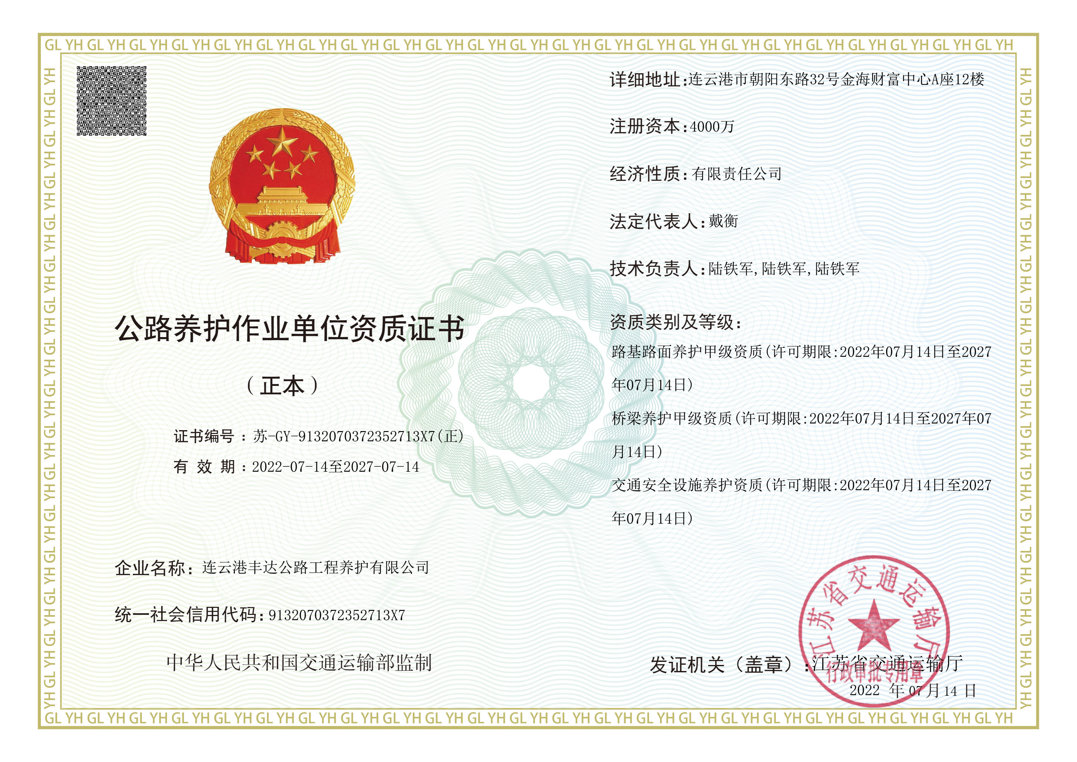 7月14日,豐達(dá)公司此次申報(bào)的公路養(yǎng)護(hù)作業(yè)單位資質(zhì)“路基路面甲級(jí)、橋梁甲級(jí)、交通安全設(shè)施”三個(gè)專業(yè)順利通過(guò)江蘇省交通運(yùn)輸廳核準(zhǔn),申報(bào)成功。